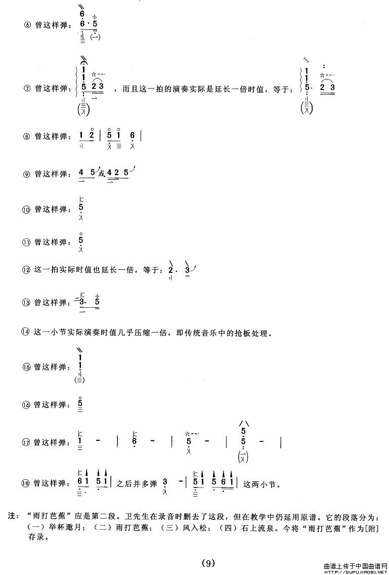 乐曲在流传中形成了四段、五段、三段等多种版本,目前以汪昱庭派的卫仲乐、李廷松弹奏的版本为多。此派传谱由“举杯邀月”、“雨打芭蕉”、“风入松”、“石上流泉”四段联缀而成。此曲虽为多段联缀,但主题音调贯串于全曲,而且二、三、四段的前二十八小节基本相同,因而全曲显得统一集中,并带有“合头”式变奏的特点。