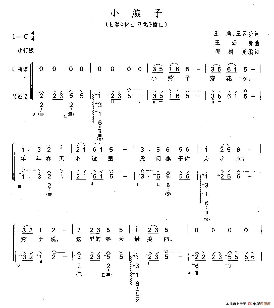 小燕子 邹树亮编订 琵琶弹唱曲谱,选自邹树亮《跟我学琵琶弹唱》。