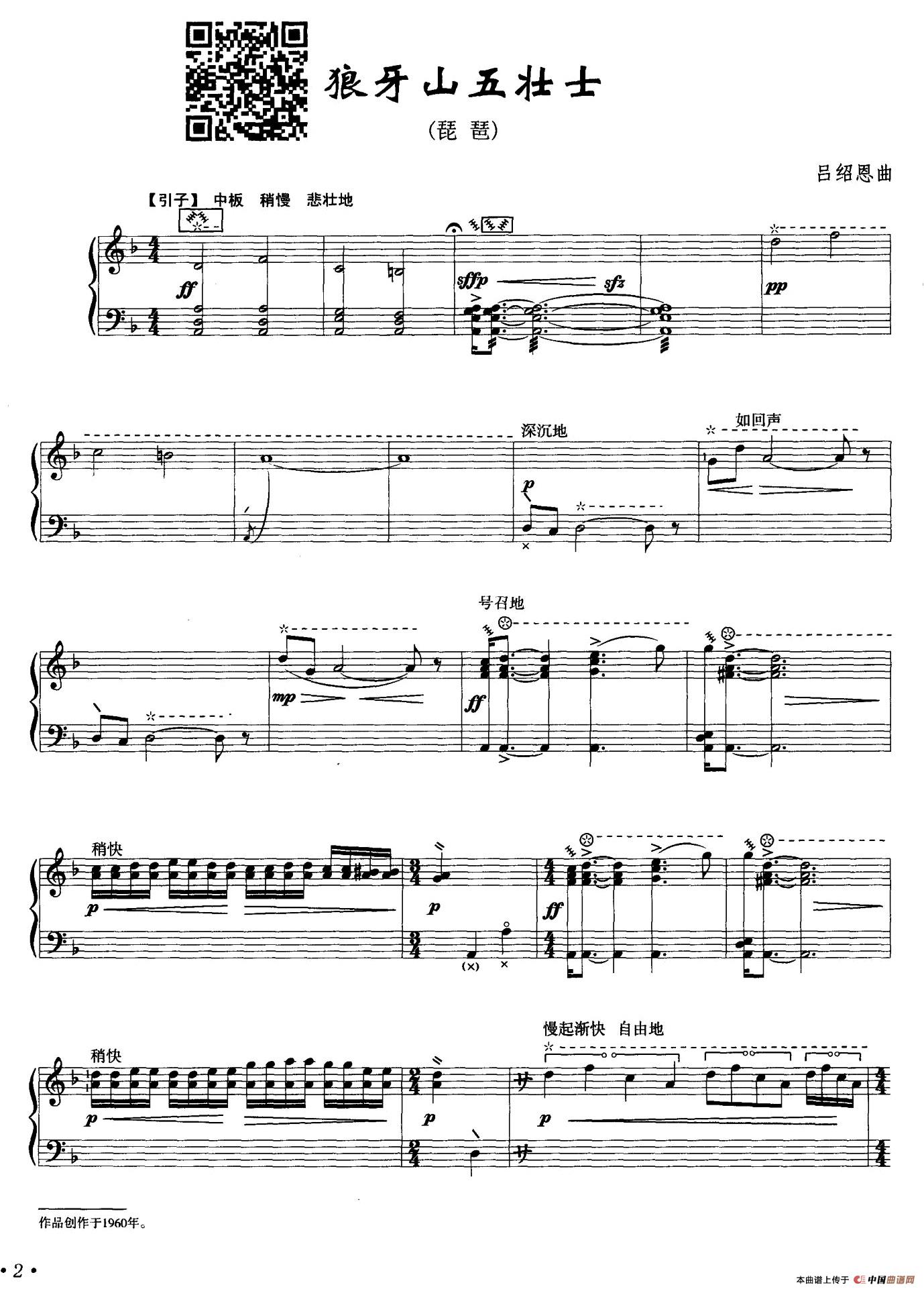 谱友论坛上传了这首乐曲的相关简介“”吕绍恩教授谈琵琶名曲《狼牙山五壮士》创作历程 ”:http://bbs.qupu123.com/thread-6532-1-1.html