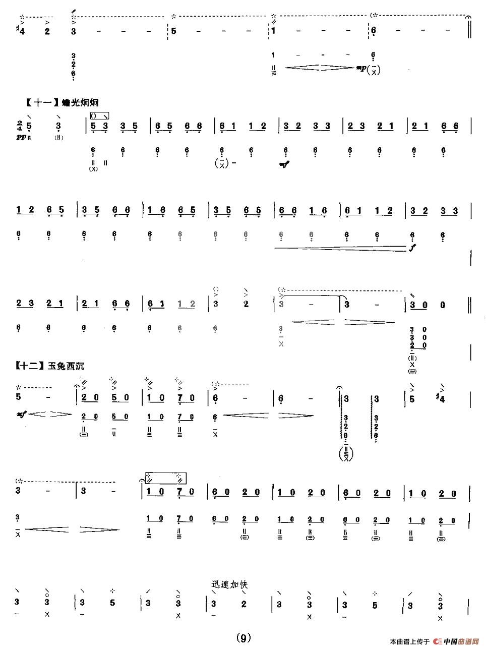 第十一段“蟾光炯炯”、第十二段“玉兔西沉”,乐曲重新把人带回现实,最后从月落西山结束全篇。