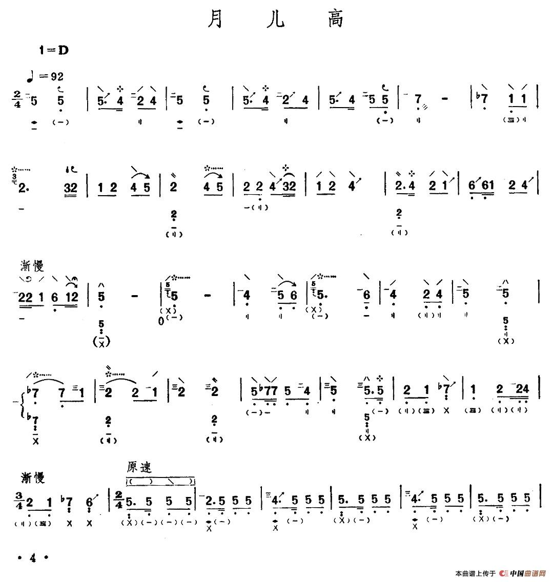 《月儿高》最早为套曲形式,由南北曲“月儿高”、“桂枝香”、“解三醒”、“玉抱肚”等七个曲牌组成,曲谱载于清嘉庆年间荣斋所编的《弦索备忘》中,是用琵琶、胡琴、三弦等乐器演奏的合奏谱。谱后有注云:“相传曰唐明皇游月宫闻记之音。”随后在华秋萍编辑的《琵琶谱》中也收录了它,但已去掉原曲牌名,而代之以“海岛冰轮”、“江楼望月”、“海峤踌蹰”等十二修养写景性的段落小标题,与现在通行的谱相同。建国以后,作曲家、指挥家彭修文又将其改编成合奏曲,保存了原曲的结构、旋律和风格,添加了二胡、箫等抒情乐器,使得乐曲更加细腻优美,音色更为柔。