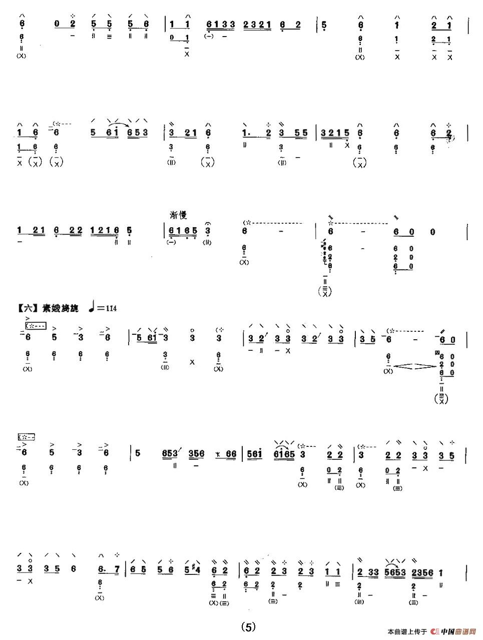 第五段“苋露满天”,写皎洁月光下的天空和大地既明亮又朦胧,给人一种风露满天、气氛森然的感觉。乐曲以较快的速度和较强的力度,造成一种空漠浩大的效果,渲染了夜深时天地间万籁俱寂中常能感到的一种逼人的气势。