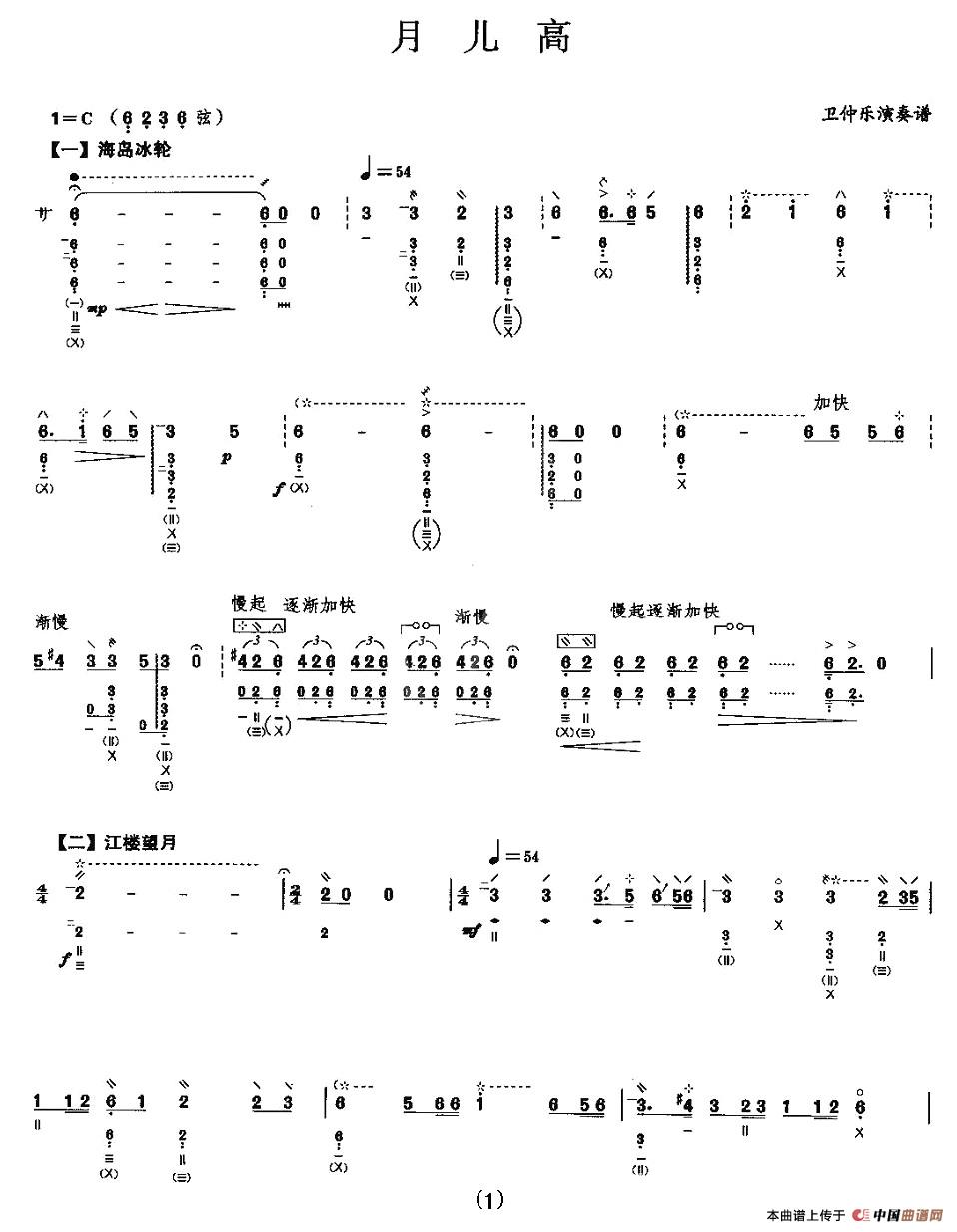《月儿高》是一首风格淡雅、朦胧,写尽了月色皎洁迷离的乐曲。它描写了月亮从海上升起直到西山沉没这一过程中的种种景色和意韵。这里有浩瀚的海涛,也有涓涓的细流;有幽静的庭院,也有广阔的田野;有如洗的碧空,点点的繁星,也有奔流的江河,清凉的风露;既有对现实世界的精致描写,又有对月中世界的绮丽想象。整个画面银光灼灼,诗意朦胧,令人迷醉。