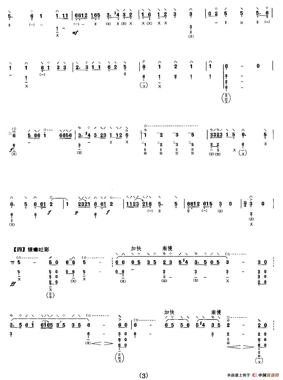 第四段“银蟾吐彩”,利用琵琶急奏所造成的繁富华丽的音色,写出升高之后的月亮更为丰富迷人的光彩。