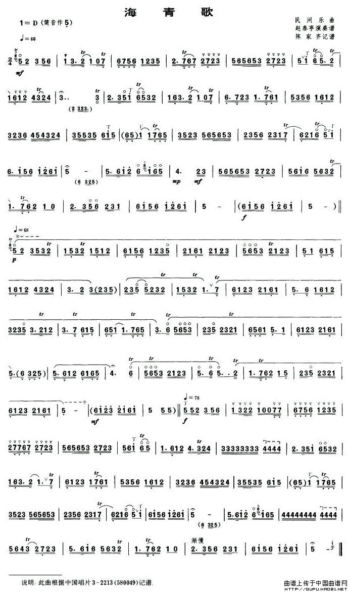 《海青歌》亦名《海琴歌》,源于戏曲曲牌,一眼板,计二十八板五十六拍。早期曲谱较简单,但节奏明快,情绪活跃。此曲在河北地区广为流传。因演奏者不同,技巧发挥和旋律变化情形差异较大。形成色彩各异的多种曲谱。 本曲是赵春亭先生演奏技艺和风格的代表作之一。