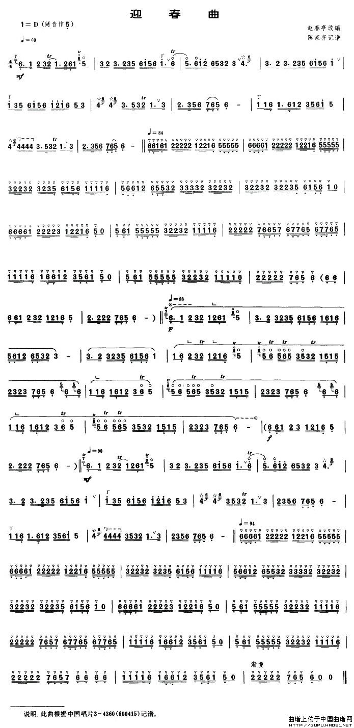 同一个音乐素材,采用不同的发展、变化手段,可以产生多种不同情绪的,甚至与原音乐素材在性格上完全相反的音乐效果。迎春曲》既如此。乐曲以东北民歌《悲秋》为素材,通过发展变化和演奏方法上的精心处理,使原来凄婉、悲凉的曲调变成了明快而欢乐的旋律。