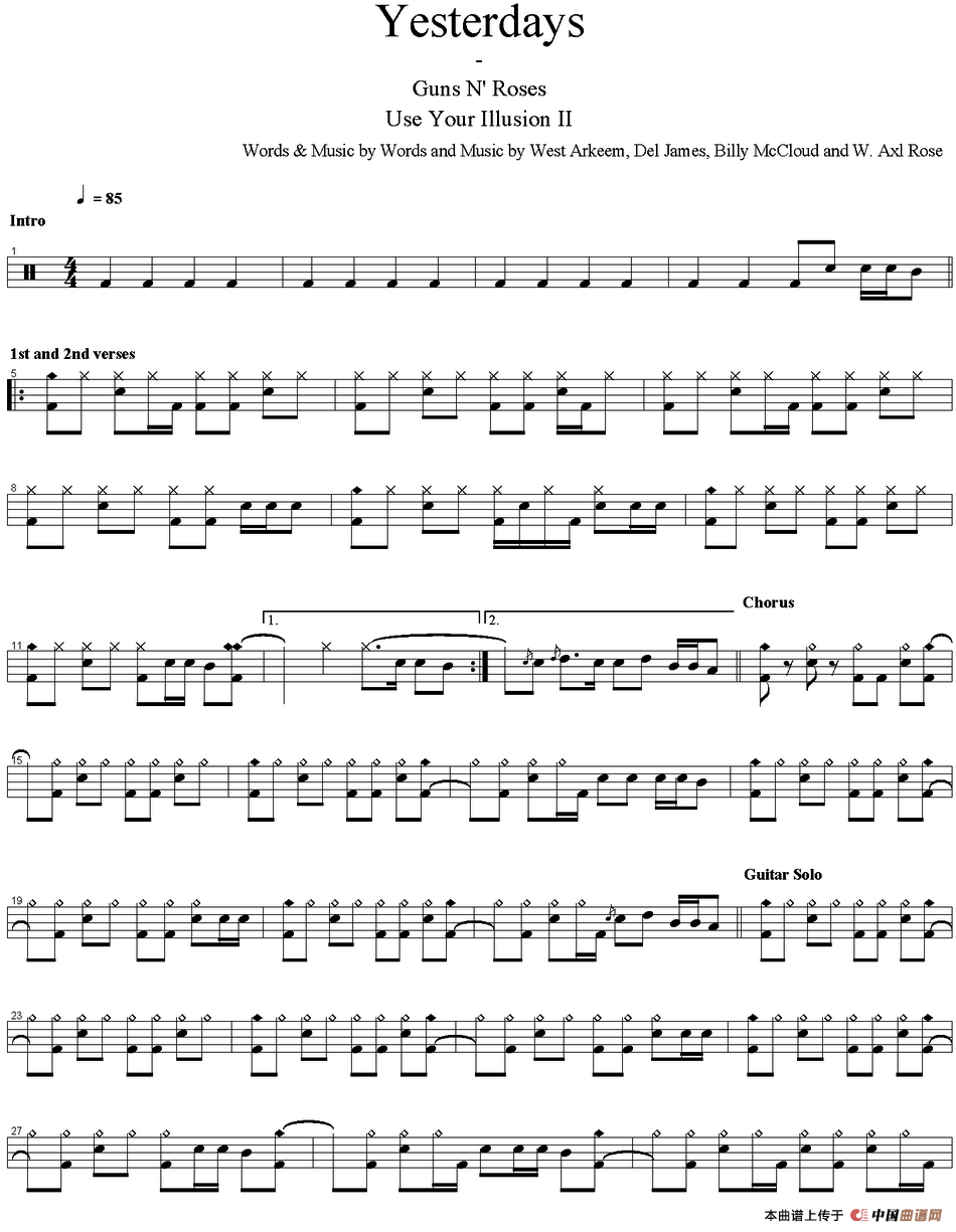 爵士鼓谱:Guns n' Roses - Yesterdays