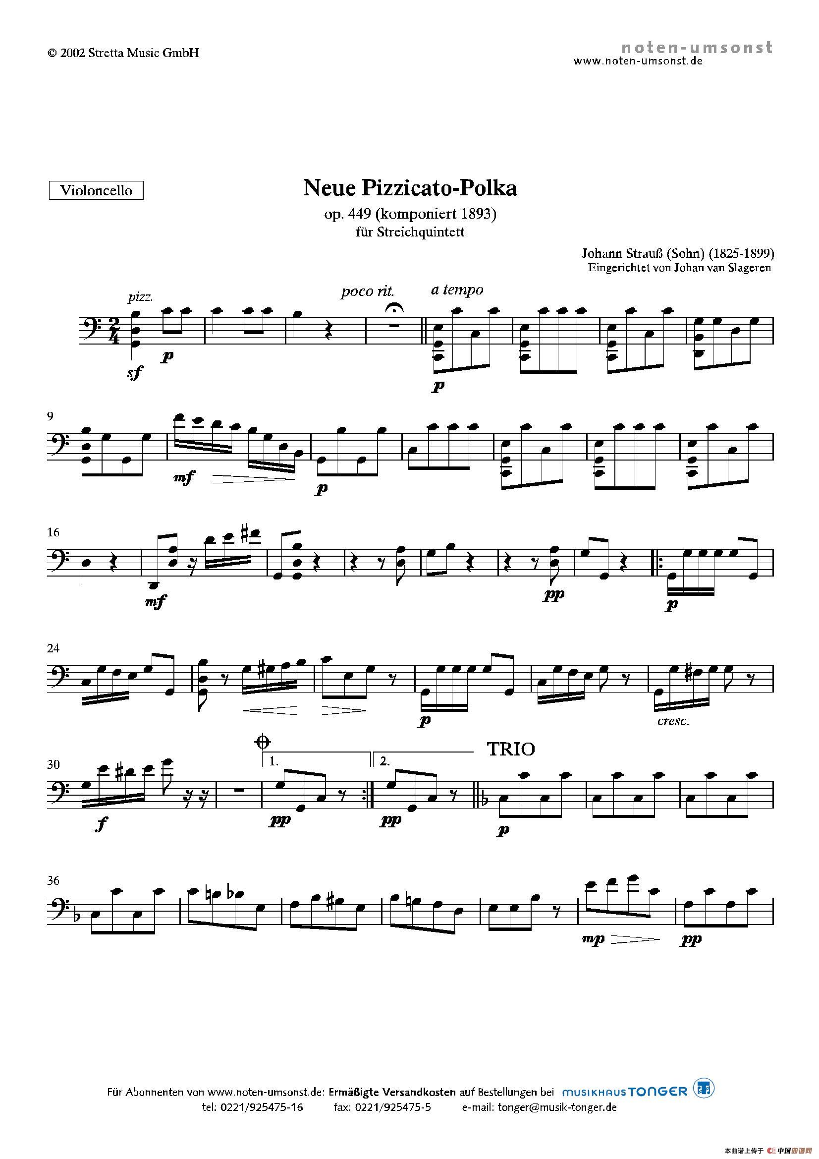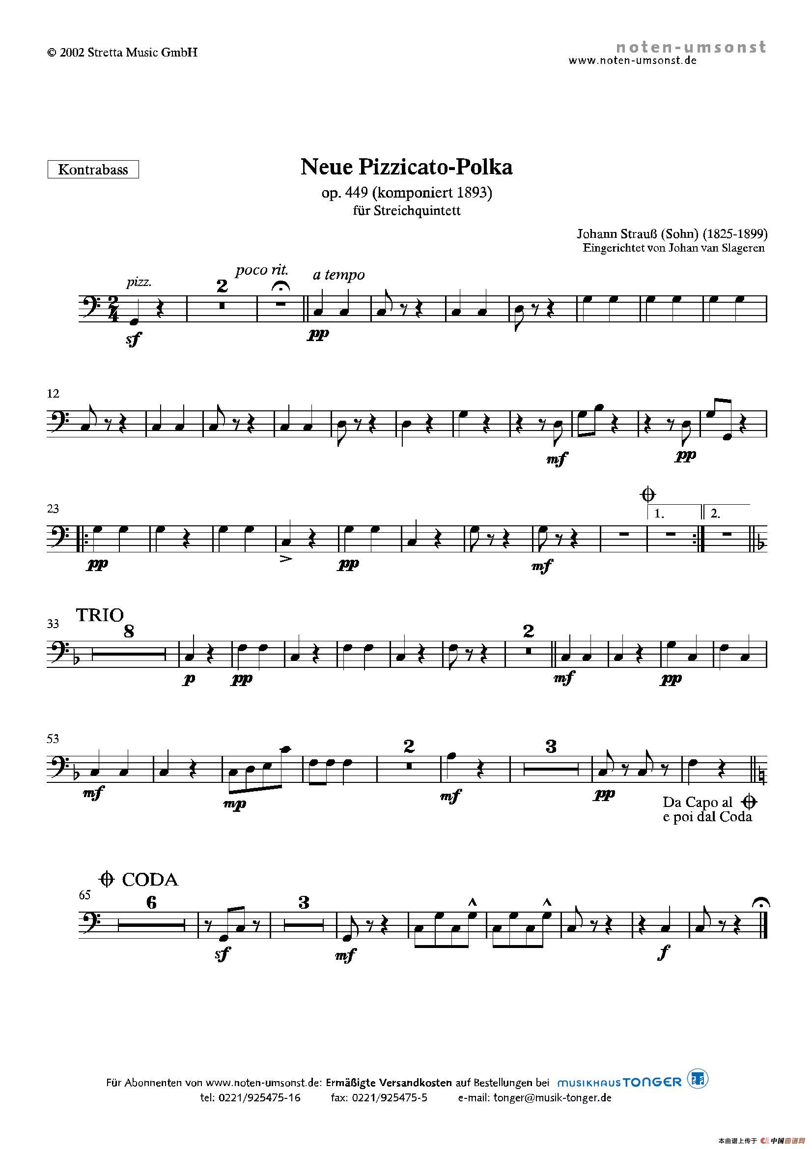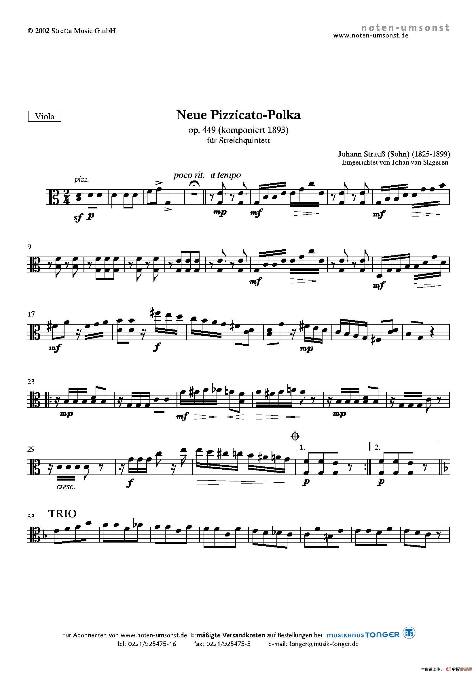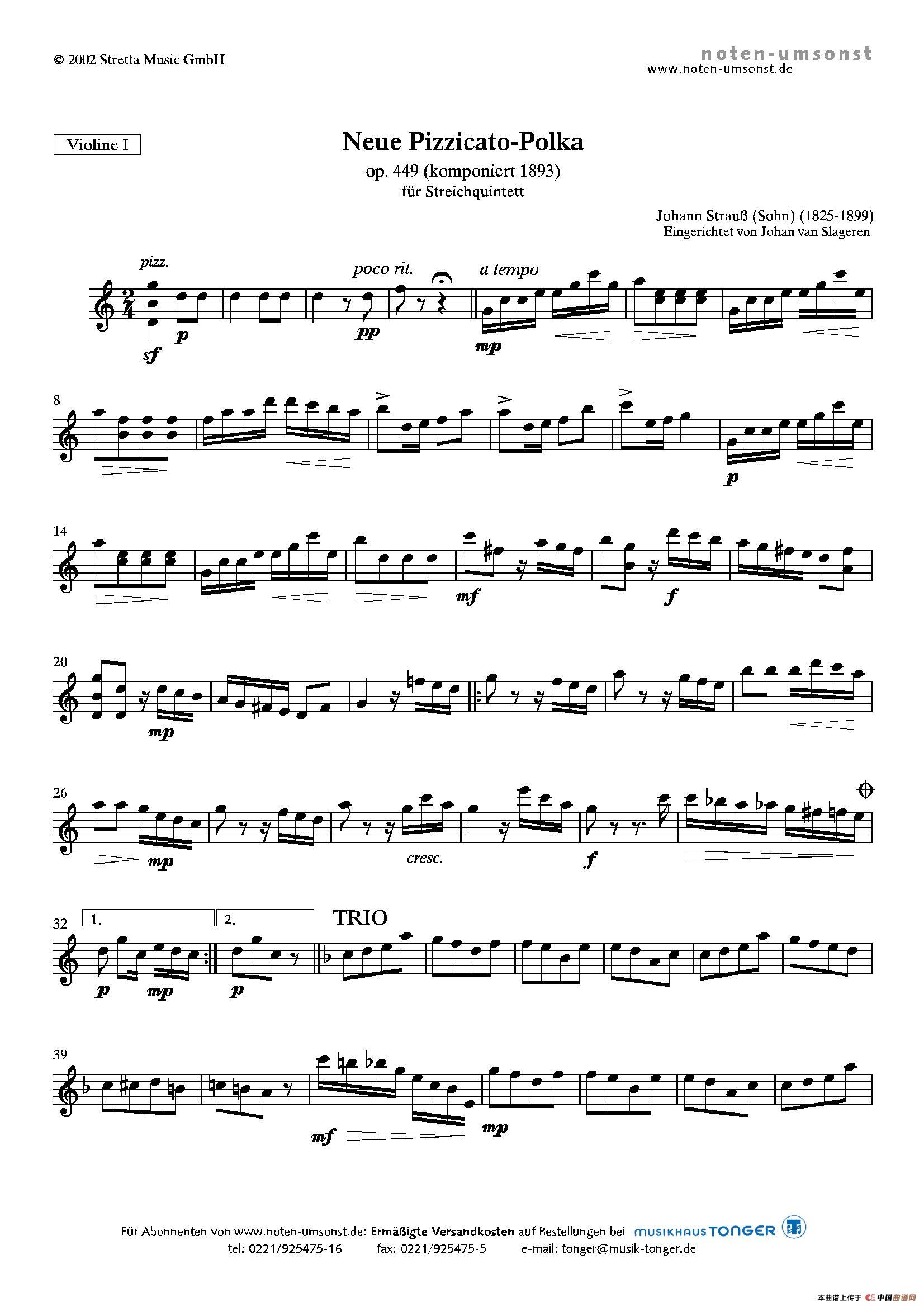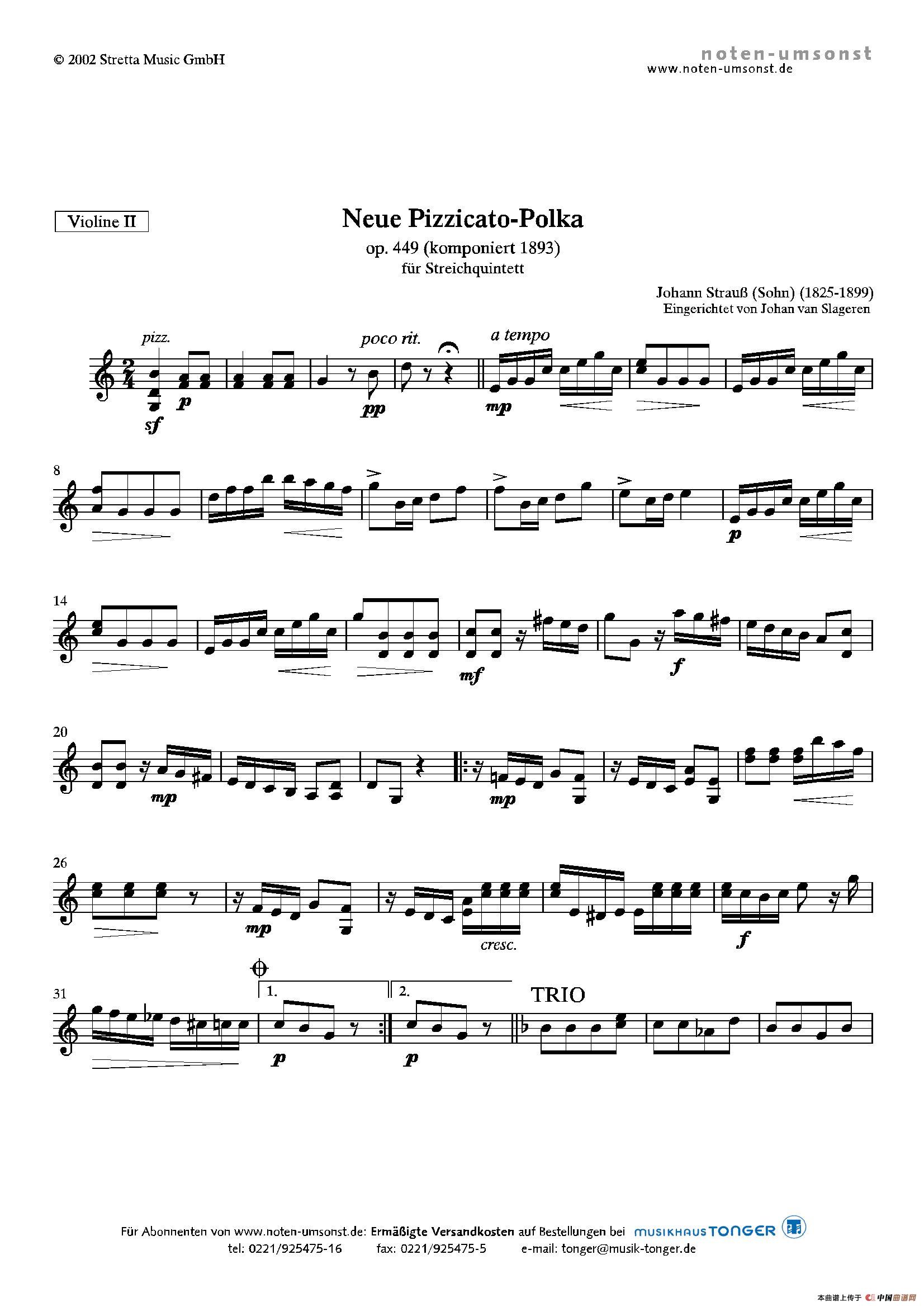 原标题:[重奏曲] 斯特劳斯《新拨弦波尔卡》Johann Strauss《Neue Pizzicato Polka》op.449(弦乐五重奏总谱+分谱,C大调。)