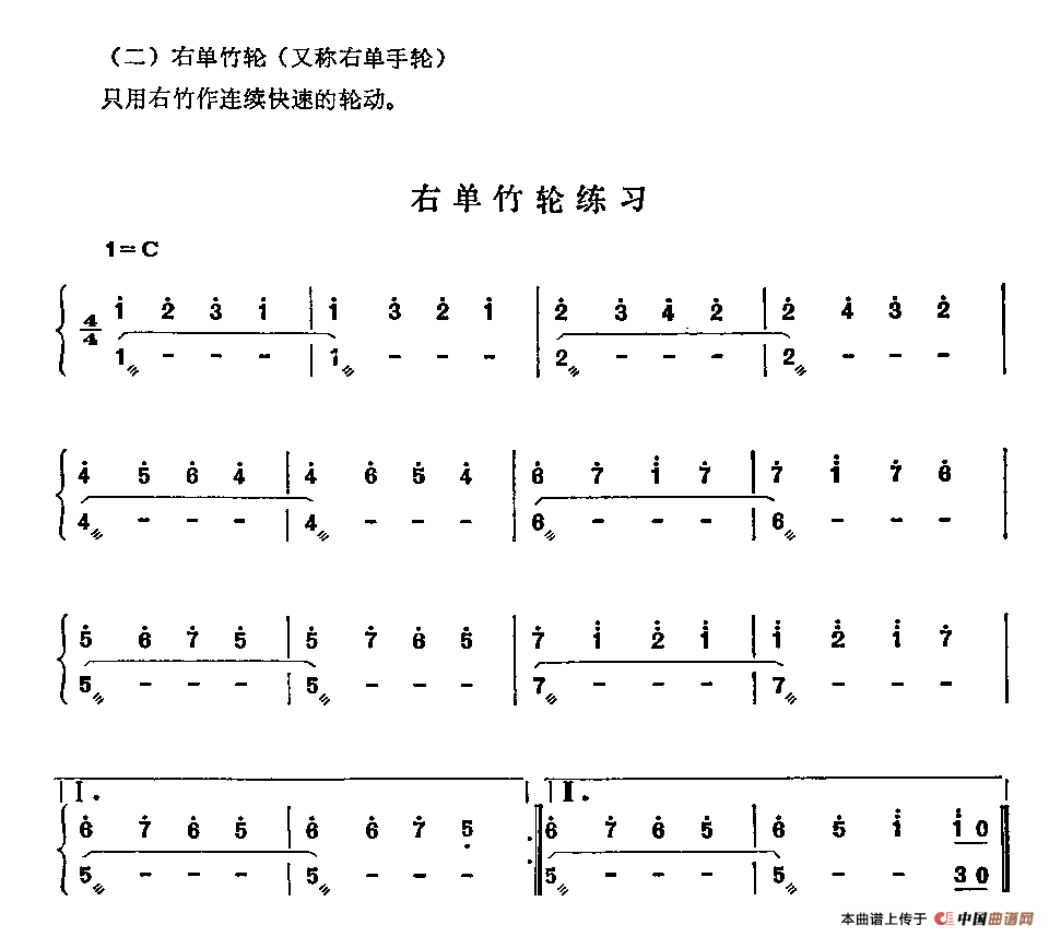 扬琴基本功训练,即右单手轮练习,就是右竹作连续快速的轮动。