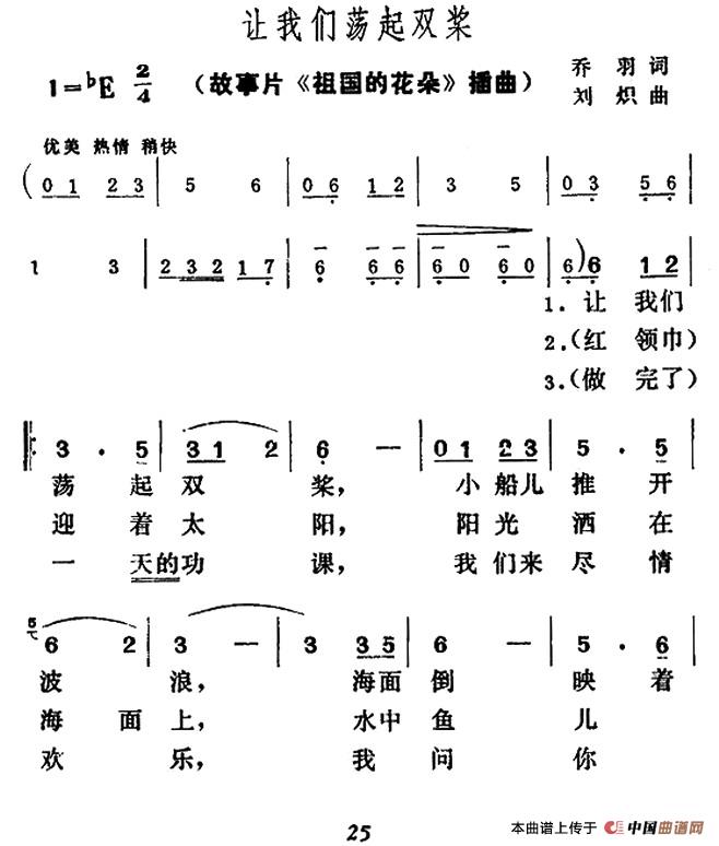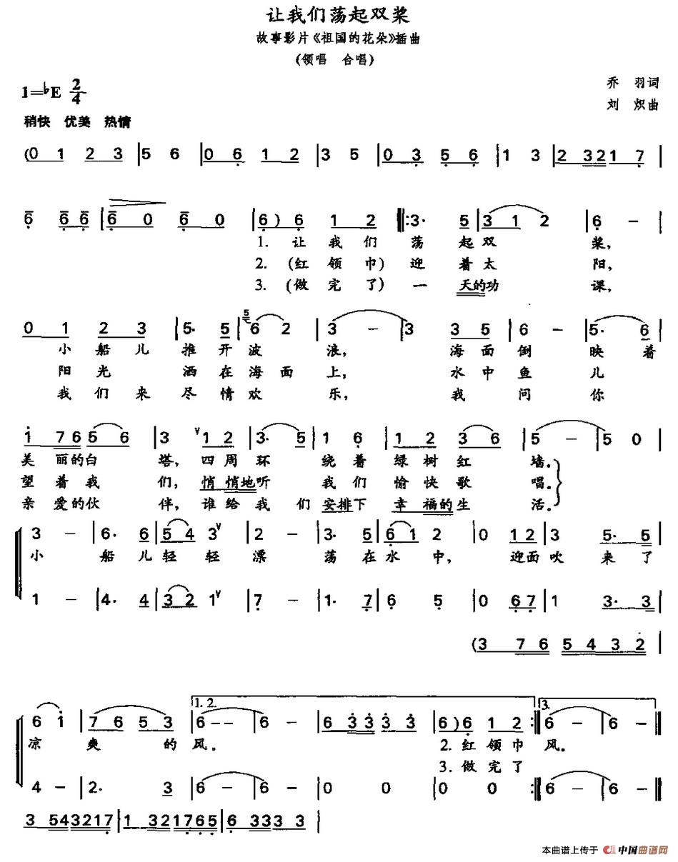 《让我们荡起双桨》是1955年拍摄的少儿电影《祖国的花朵》主题曲。这首由刘炽先生作曲,乔羽先生作词,旋律优美、节奏轻快的歌曲,创作于上世纪50年代,横跨半个世纪,影响了足足三代少先队员。并于2002年在北师大版小学三年级课本上被选为课文。《让我们荡起双桨》作为新中国第一部儿童电影的主题曲,为新中国最受儿童喜爱的歌曲之一。这首歌在五十年代可谓是红遍华夏大地,可以说无人不知,无人不晓,并深受喜爱。它实际上是电影故事片《祖国的花朵》中的主题曲。这部电影是长春电影制片厂1955年摄制完成的,是新中国的第一部儿童影片。就创作而言,这首歌是为《祖国的花朵》专门定制的,它必须依附于这部电影故事的本身,才更有价值和意义。