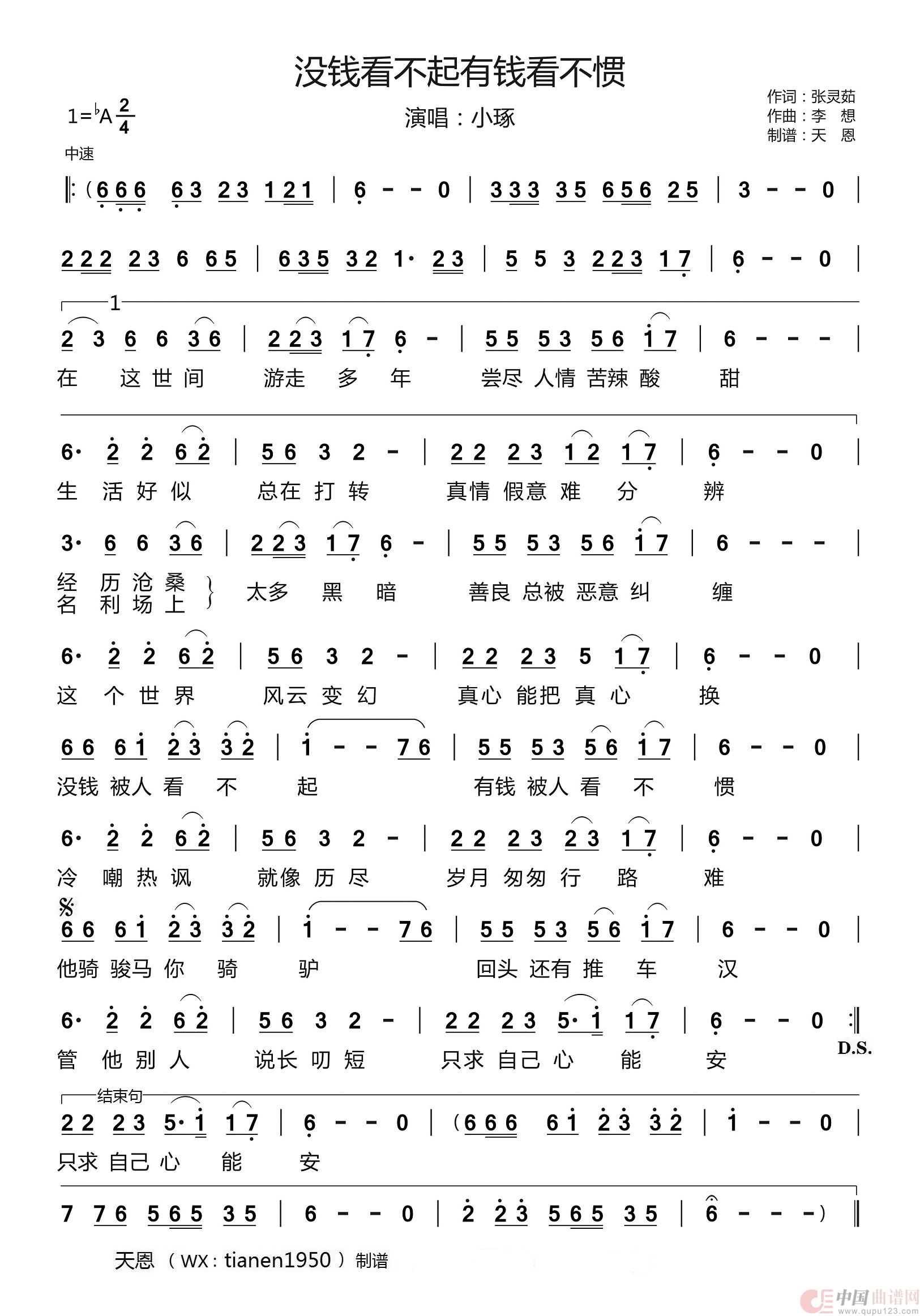 关于《没钱看不起有钱看不惯》曲谱的评论
