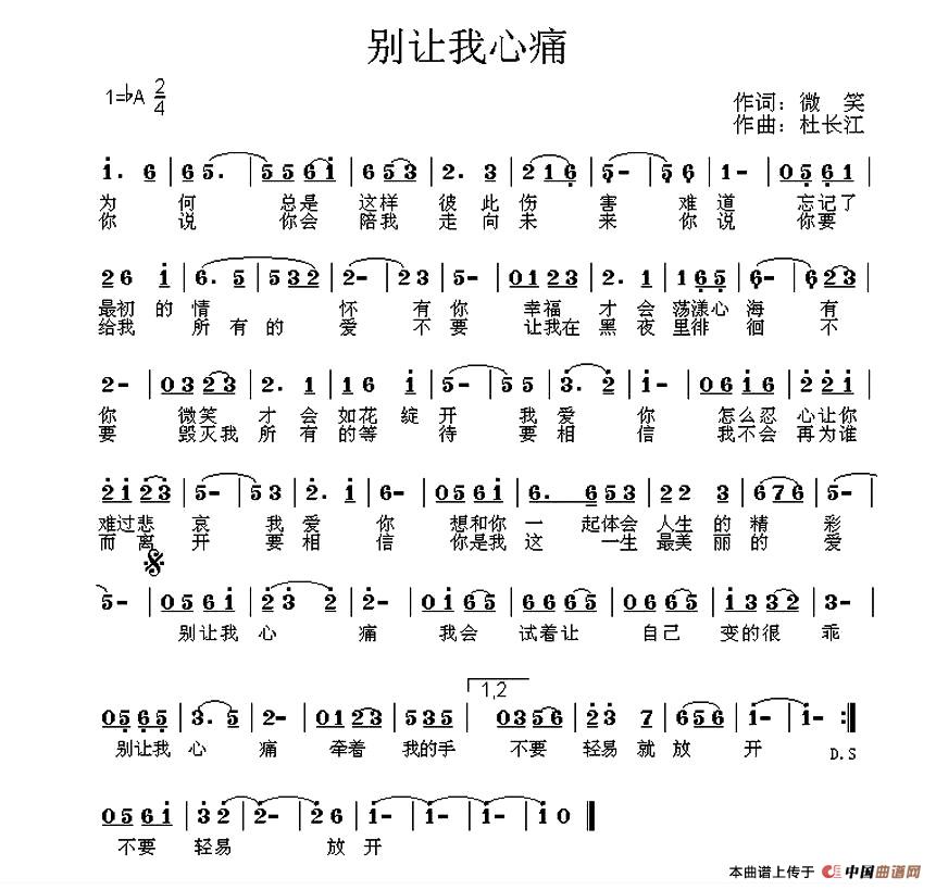 作词:周 璇(幸福微笑) 作曲:杜长江(大军南下) 演唱:李金华(晓 依) 为何 总是这样彼此伤害 难道 忘记了最初的情怀 有你 幸福才会荡漾心海 有你 微笑才会如花绽开 我爱你 怎么忍心让你难过悲哀 我爱你 想和你一起体会人生的精彩 别让我心痛 我会试着让自己变的很乖 别让我心痛 牵着我的手不要轻易就放开 ………… 你说 你会陪我走向未来 你说 你要给我所有的爱 不要 让我在黑夜里徘徊 不要 毁灭我所有的等待 要相信 我不会再为谁而离开 要相信 你是我这一生最美丽的爱 别让我心痛 我会试着让自己变的很乖 别让我心痛 牵着我的手不要轻易就放开 ………… |