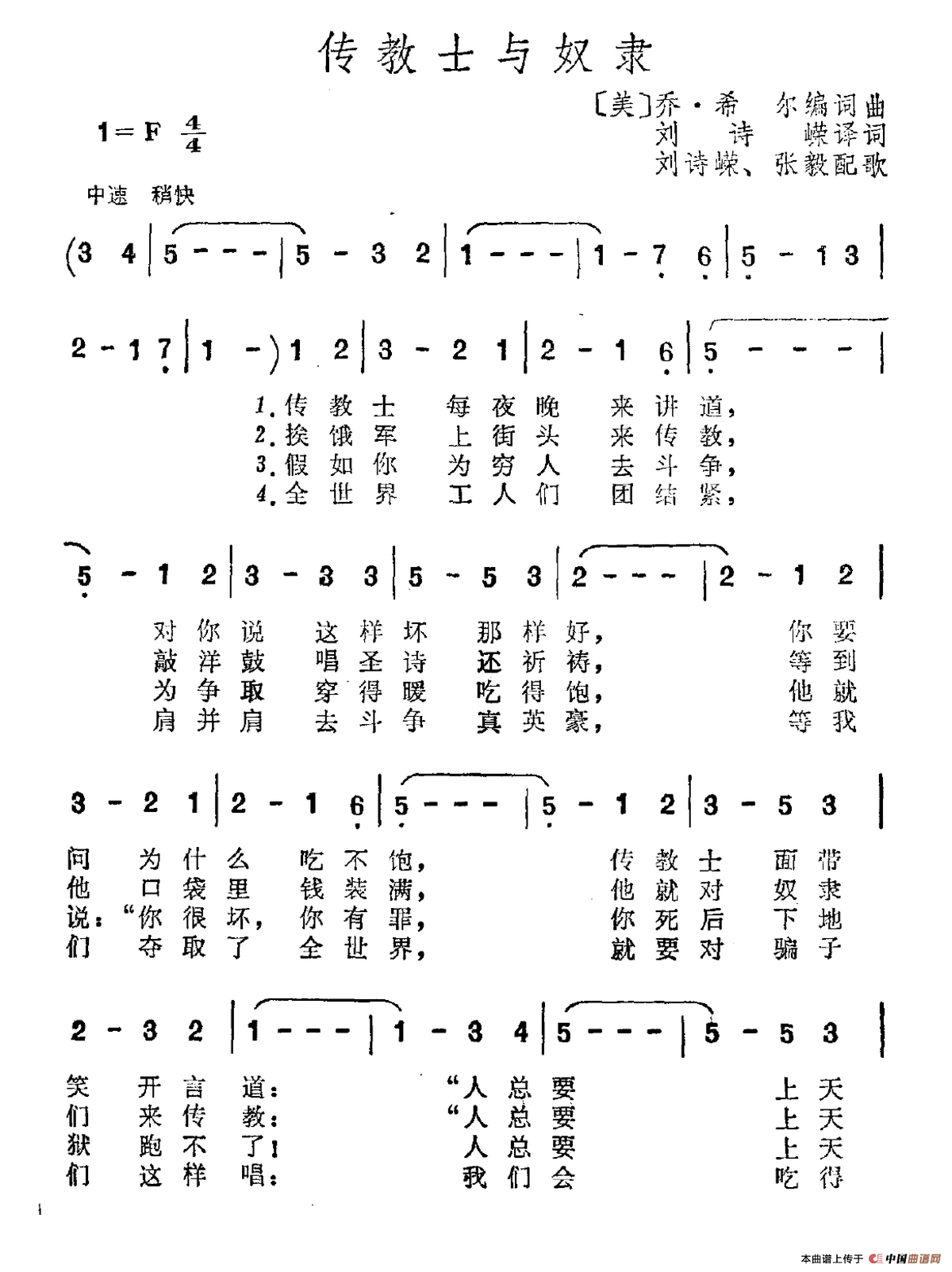 作词:乔·希尔编词、刘诗嵘译词 作曲:乔·希尔编曲、刘诗嵘、张毅配歌 来源:中国曲谱网 上传:热爱音乐88