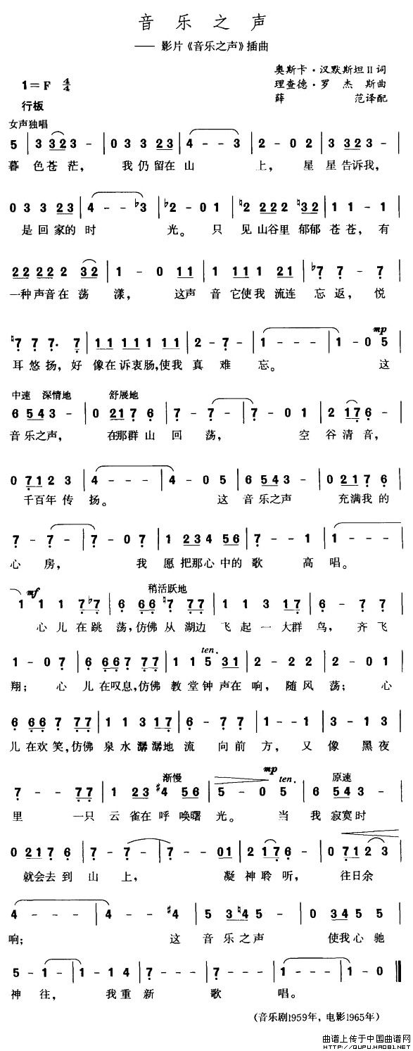 《音乐之声》根据玛丽·冯·特拉普夫人1949年出版的自传改编成音乐剧,1959年上演时,盛况空前,获得该年度托尼最佳音乐剧奖。1965年由罗伯特·怀斯执导搬上银幕,又获得最佳影片、最佳导演、最佳音响、剪辑、配乐等5项奥斯卡奖。 这一首是影片的序歌。