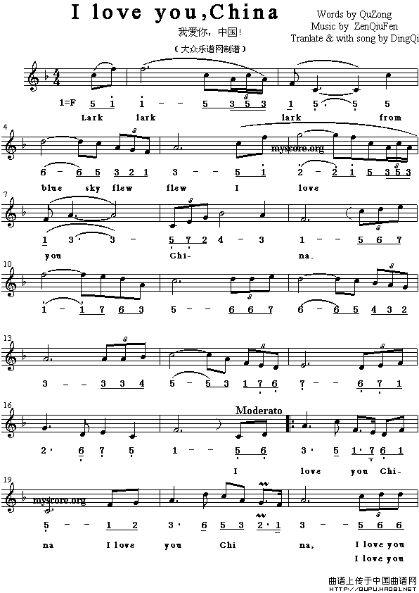 I love you china(我爱你,中国)(英译中文歌曲、线简谱混排版)