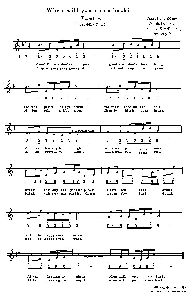 When will you come back(何日君再来 [英译中文歌曲、线简谱混排版])