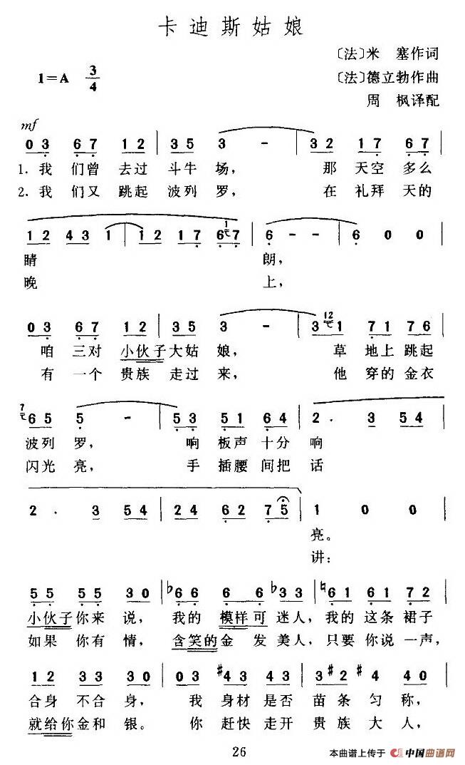 关于《[法]卡迪斯姑娘》曲谱的评论