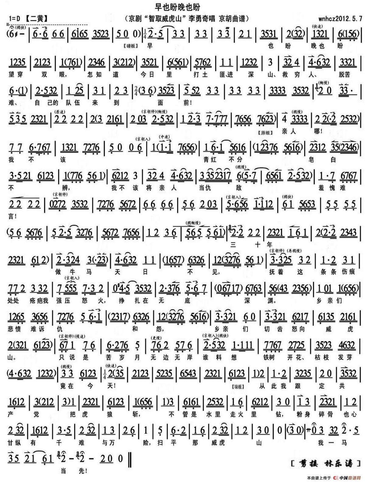 早也盼晚也盼(《智取威虎山》李勇奇唱段、京胡曲谱)