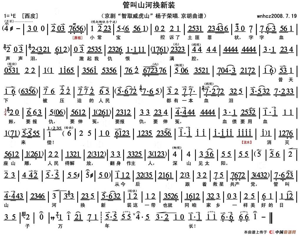 管叫山河换新装(《智取威虎山》杨子荣唱段、京胡曲谱)