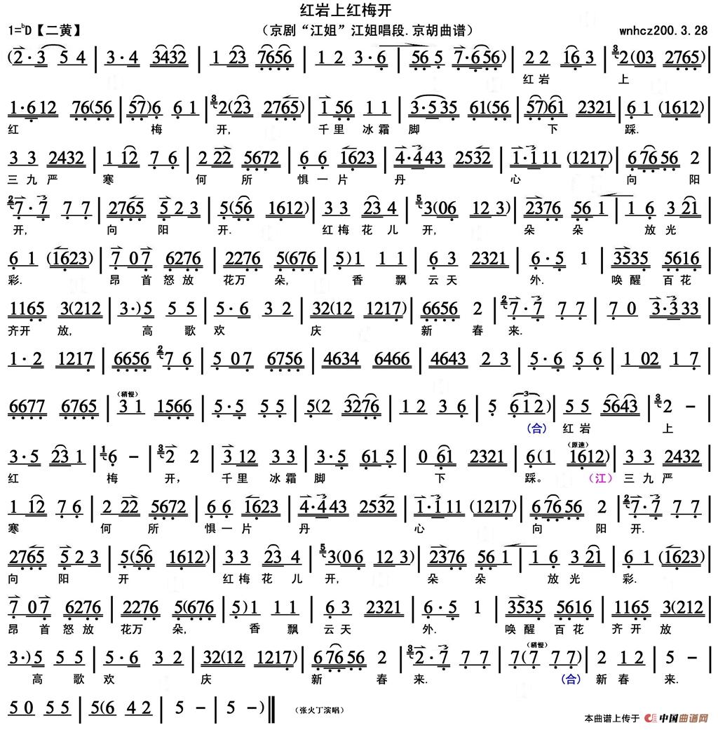 红岩上红梅开(《江姐》江姐唱段、京胡曲谱)