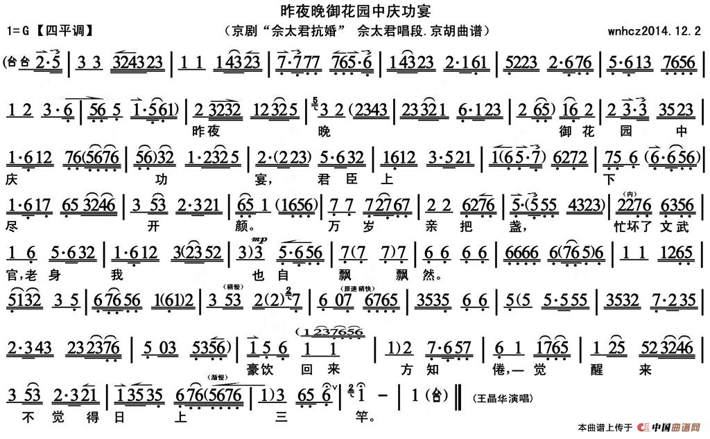 昨夜晚御花园中庆功宴(《佘太君抗婚》佘太君唱段、京胡曲谱)