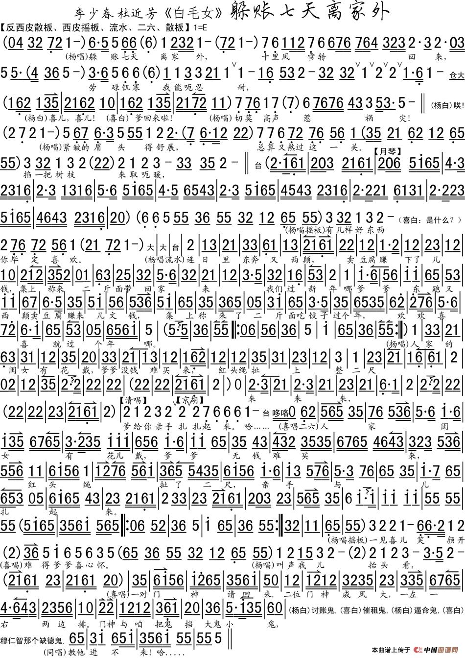 躲账七天离家外(《白毛女》选段、琴谱)