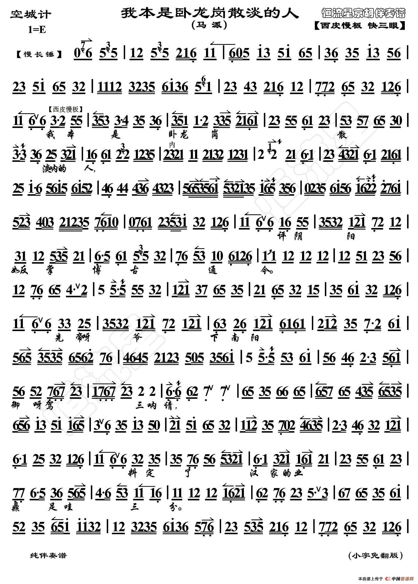 我本是卧龙岗散淡的人(京剧《空城计》诸葛亮唱段、琴谱、恒流星制谱版)