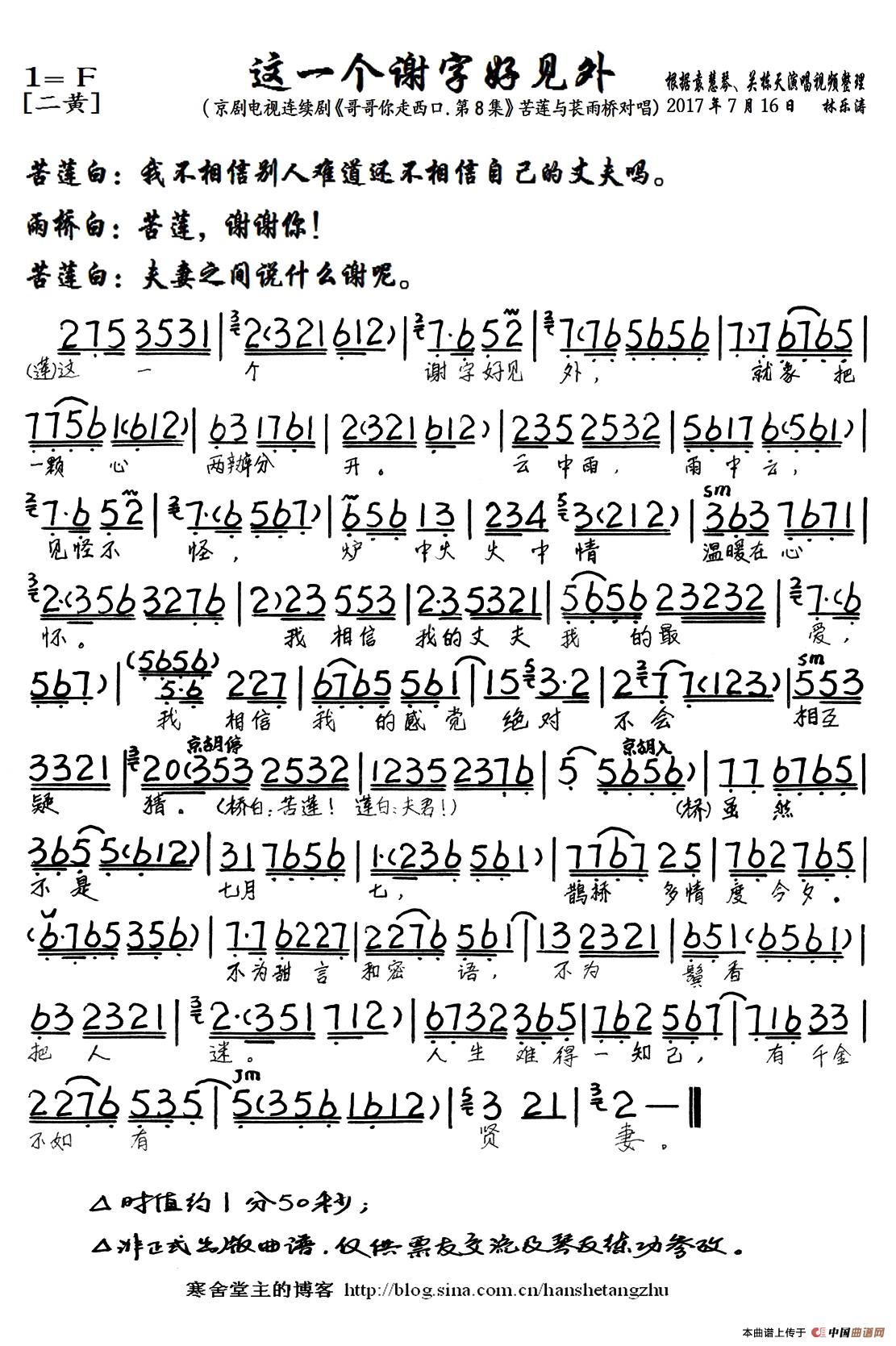 这一个谢字好见外(京剧电视剧《哥哥你走西口·第八集》选段、琴谱)