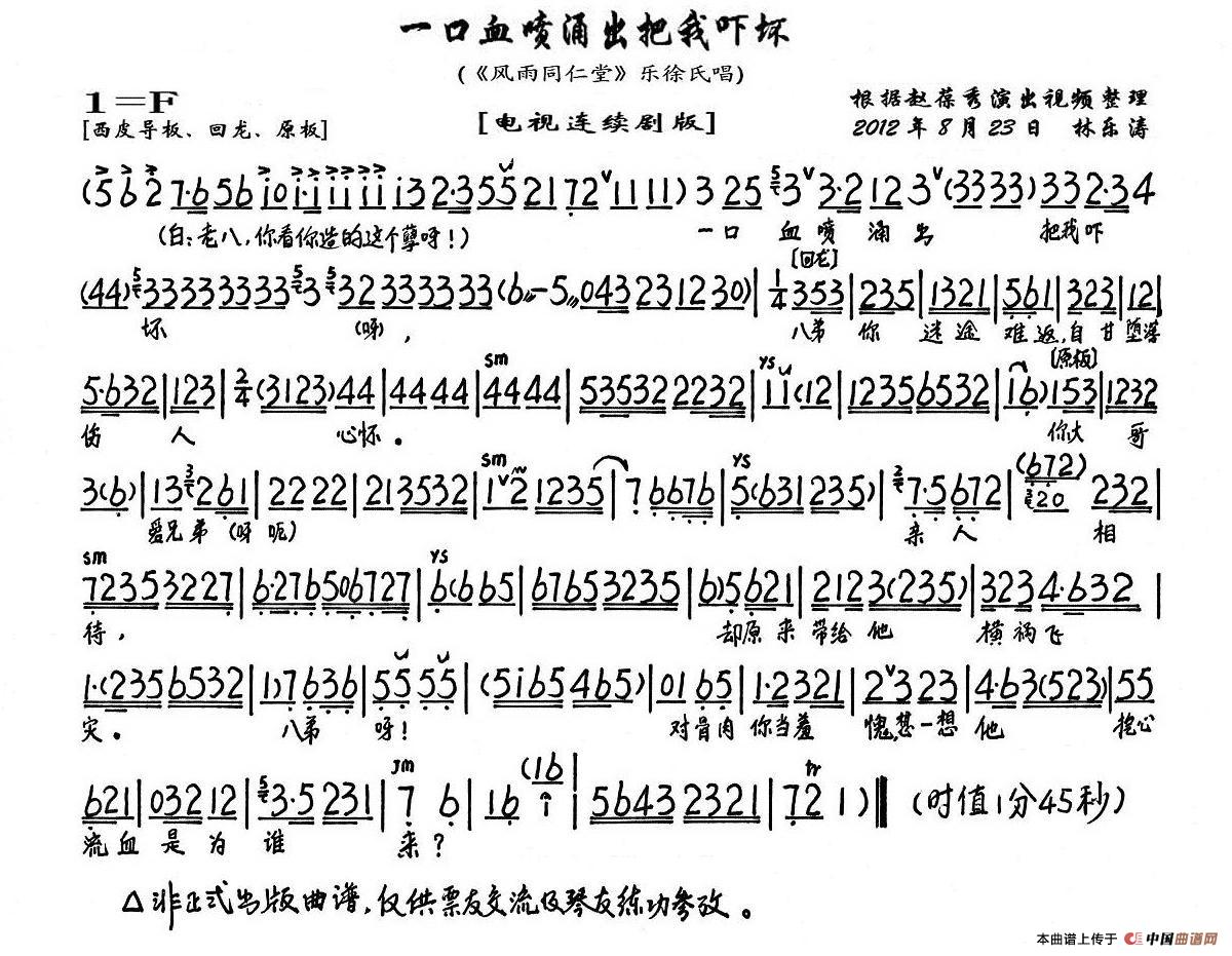 一口血喷涌出把我吓坏(《风雨同仁堂》乐徐氏唱段、琴谱)
