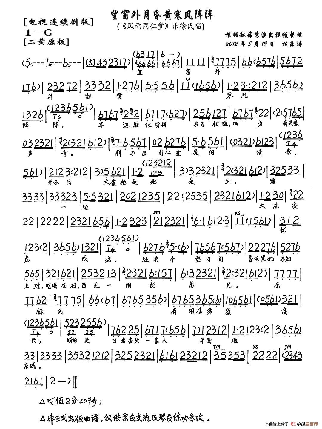 望窗外月昏黄寒风阵阵(《风雨同仁堂》乐徐氏唱段、琴谱)