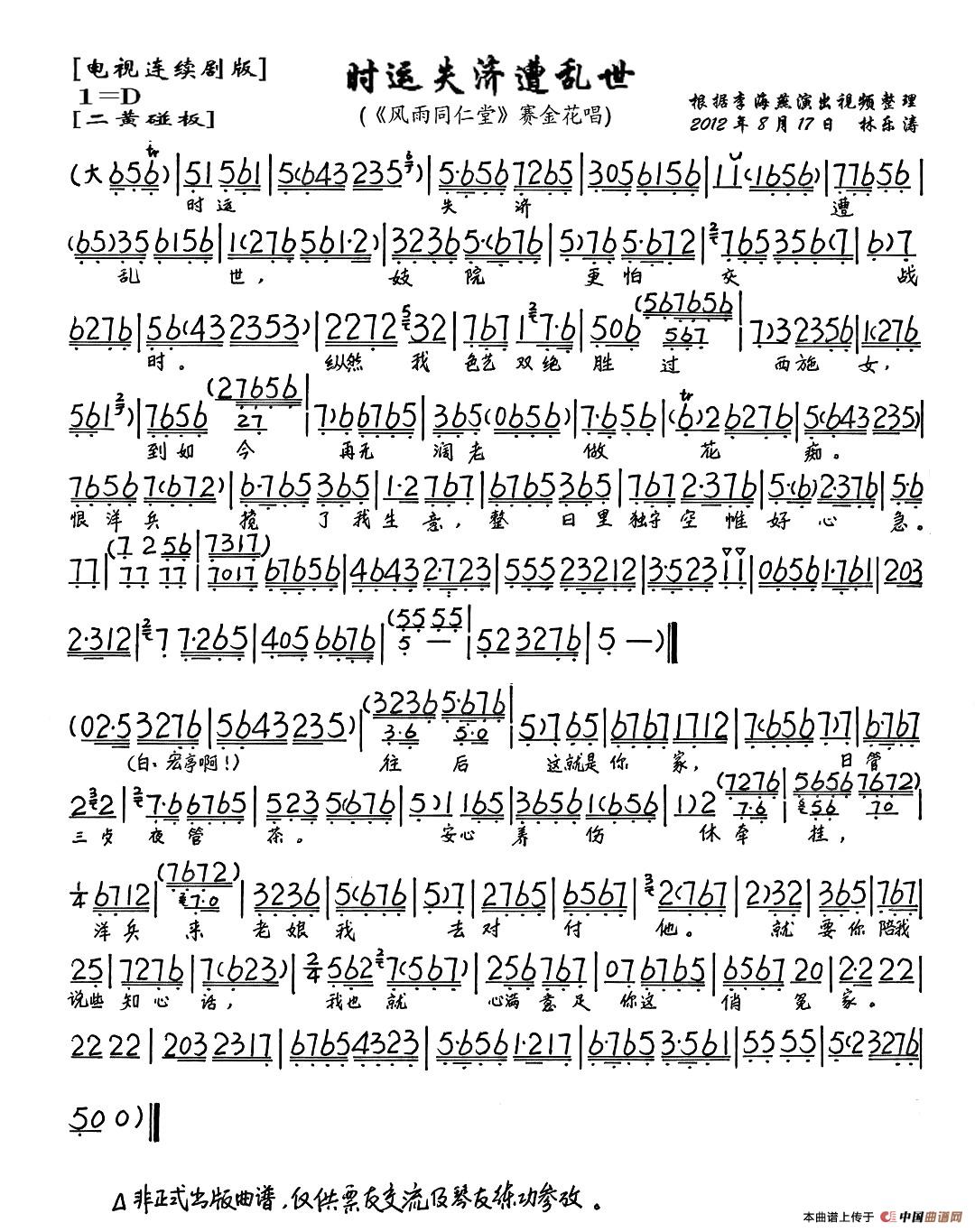 时运失济遭乱世(《风雨同仁堂》赛金花唱段、琴谱)