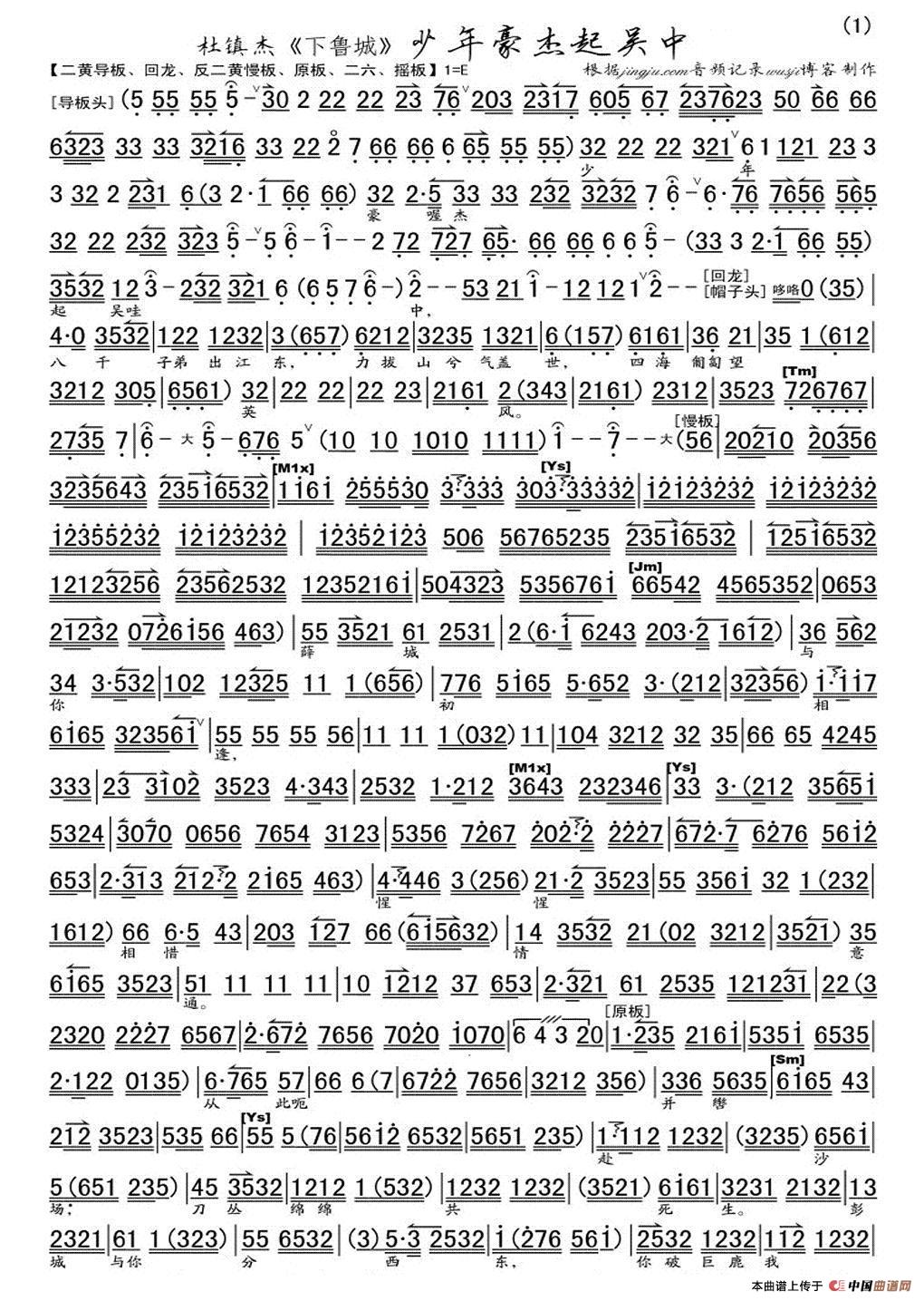 少年豪杰起吴中(《下鲁城》选段、琴谱)