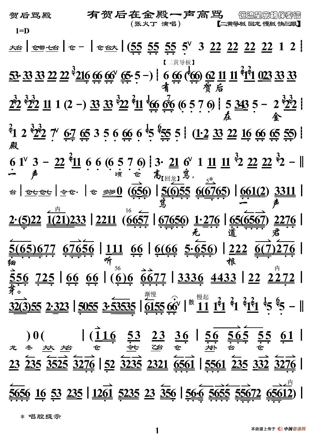 有贺后在金殿一声高骂(《贺后骂殿》选段、京胡伴奏谱)