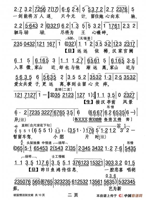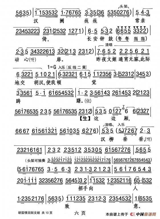 昨日鱼鸿传讯息,一腔悲喜唱胡笳,岂为新家弃旧家,感君送文姬,归里。(生唱)曹丞相驰书致意,岳丈遗篇须整理,妻你存忠存孝,我宁不相送,东归。(旦唱)切切感君明大义,(生唱)不欲离时也要离,立马汉胡边,(旦唱)徘徊,(乙反)未忍去。(旦楔白:玉门关内外,南北二故乡,心难分两半,相思比水长。行行重行行,只见旗幡招展,贤王我夫,这是什么所在? 生:这是接汉亭。乃是胡汉两邦接壤之地,军士在此,列队恭送文姬贤妻,你别胡归汉呀。旦:哦!接汉亭么?唉!正是一亭非举处,前尘十二年呀)!