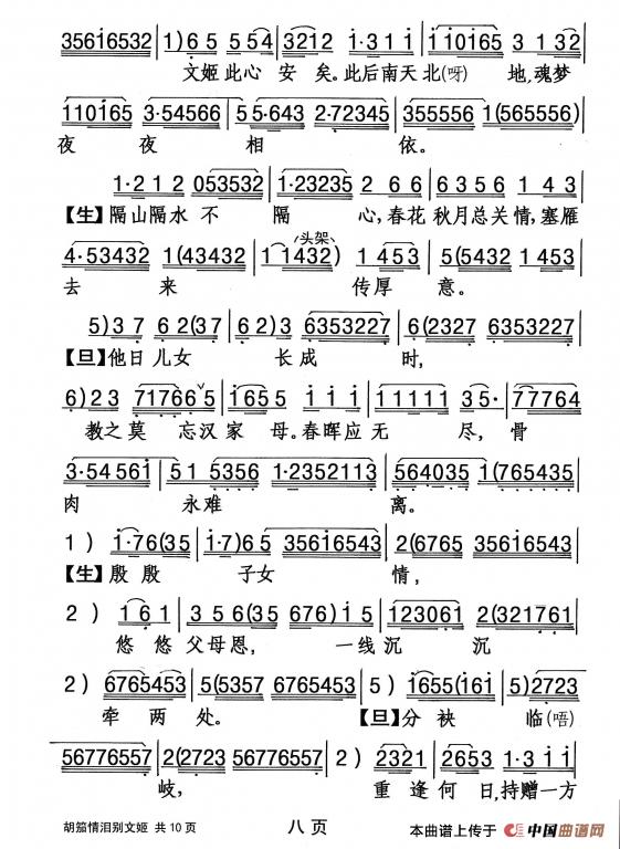 贤王大义深明,文姬此心安矣,此后南天北地,魂梦夜夜,相依。(生唱)隔山隔水不隔心,春花秋月总关情,塞雁去来,传厚意。(旦唱)他日儿女长成时,教子莫忘汉家母,春晖应无尽,骨肉,永难离。(生唱)殷殷子女情,悠悠父母恩,一线沉沉,牵两处。(旦唱)分袂临岐,重逢何日,持赠一方铜镜,聊寄万缕,情丝。(旦:此镜是我家传之宝,请贤王珍重收藏。生:多谢文姬宝镜呀)。
