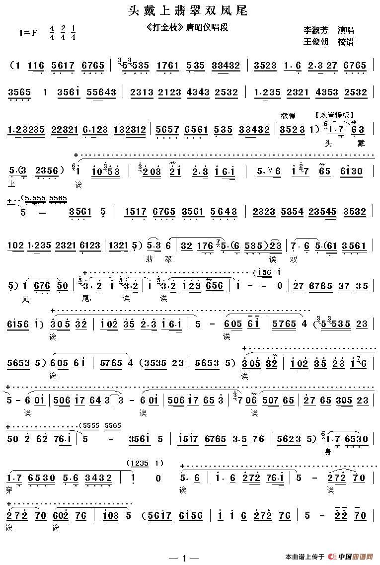 制谱者说明:李淑芳老师的戏很多戏迷都喜欢,本俱乐部也有很多资料。有网友上传了李淑芳老师《打金枝》中“头戴上翡翠双凤尾”的唱段曲谱,为大家学习提供了极大帮助,获得大家好评与感谢,本人也非常感谢。 在将曲谱与唱腔对照时突然发现曲谱中存在一些小的瑕疵,未能完全把李淑芳的唱腔风味展示出来,于是自己就在原曲谱的基础上进行了仔细校正。为了避免一些不必要的误会,本人发帖时没有说明原作者的名字,也不能写是自己记谱,只能写“校谱”。由于本人也是业余爱好,还在学习提高,错误之处在所难免,敬请行家指正。自己体会到,记写名家唱腔曲谱难度较大,如果不注明演唱者姓名,曲谱只要板式、旋律、节奏等正确就可以了。但只要注明演唱者姓名,那就要对曲谱的方方面面,尤其是那些反映名家个人演唱风格唱腔的装饰音、小弯弯、小过门等都必须力求准确,既要形似,更要神似,不可马虎。