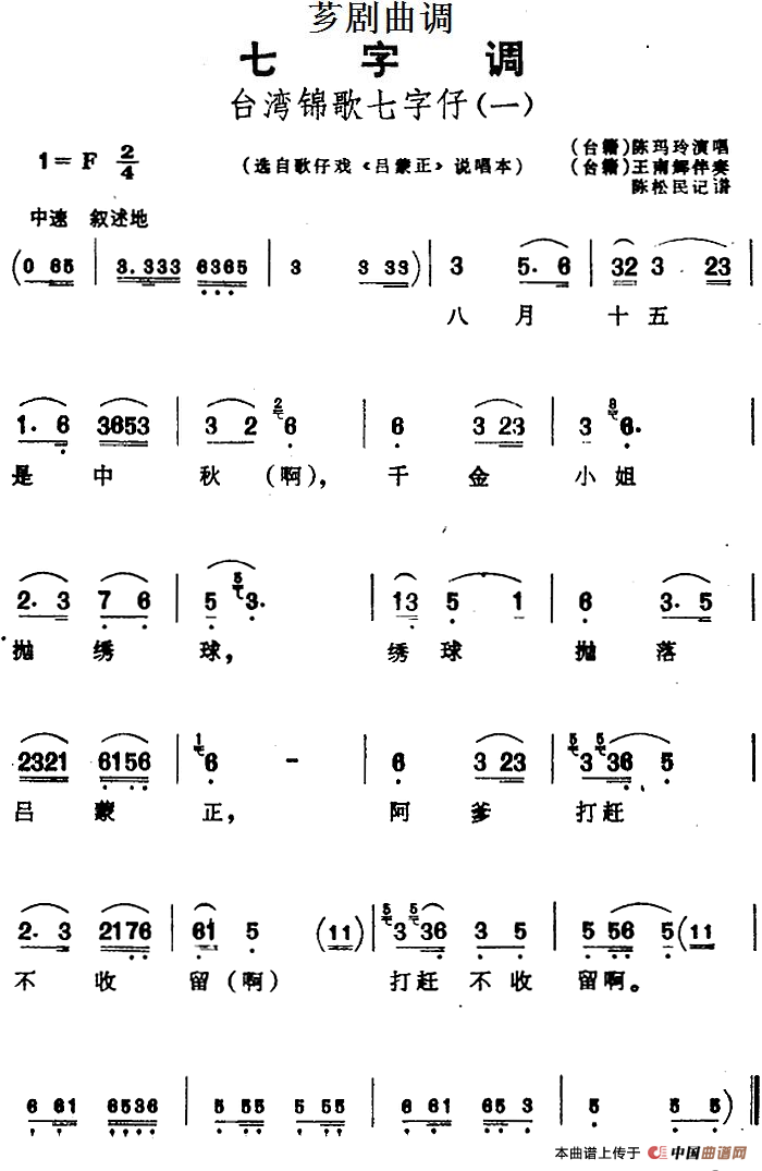 ![[芗剧曲调]台湾锦歌七字仔(2首)(选自歌仔戏《吕蒙正》说唱本)(1)_原文件名:[芗剧曲调]台湾锦歌七字仔(2首)(选自歌仔戏《吕蒙正》说唱本) 陈玛玲演唱 陈松民记谱.png](/Public/Uploads/2017/02/28/58b58a580ff8d.png)