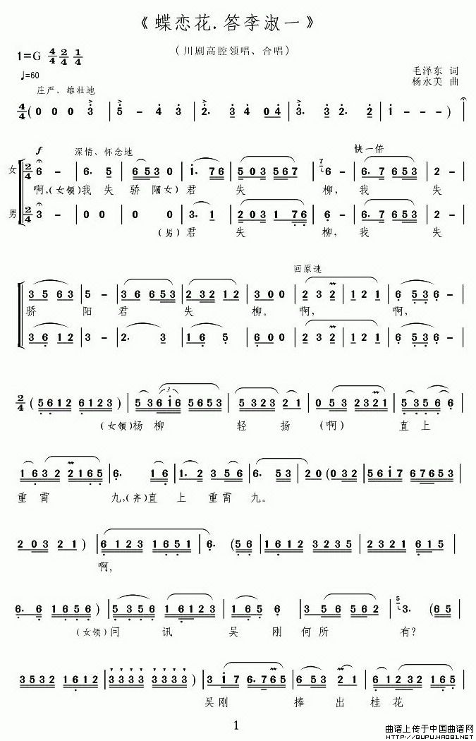 关于《[川剧高腔]蝶恋花·答李淑一》曲谱的评论