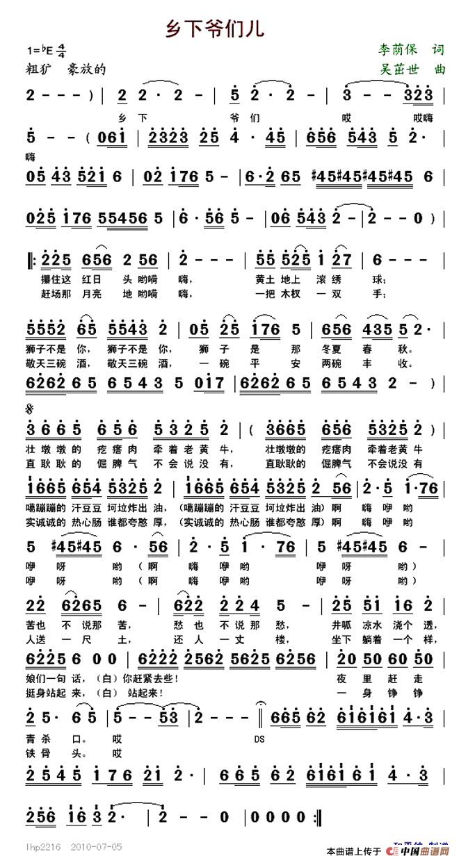 其实,最早吴茁世先生对《乡下爷们儿》的定位是面向全国普通大众,写一首大众的歌曲。但说来也巧,有一次吃完晚饭他在西安城墙脚下散步的时候,突然被人群中吼声震天的秦腔所感染,秦腔如此豪迈、如此激昂,不正是咱陕西老少爷们儿的性格吗?何不写一首关中风格的乡下爷们儿呢?关中人一样粗犷豪迈,关中男人圆滑但桀骜不驯很有性格,关中女人泼辣但刚中带柔贤惠孝顺。想写一首乡土气息浓厚的作品,这不正是理想的素材吗?于是,他彻底改变思路,经过一个多月的反复修改,2009年5月份《乡下爷们儿》的曲谱最终完成。