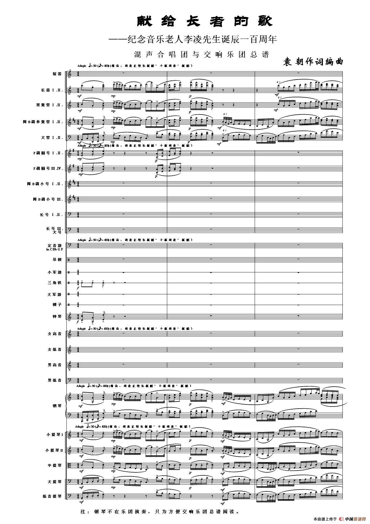 今天,将混声合唱与钢琴,配器为混声合唱与交响乐团。以十年前所作《献歌》,呈献于音乐老人李凌先生一百周年华诞!