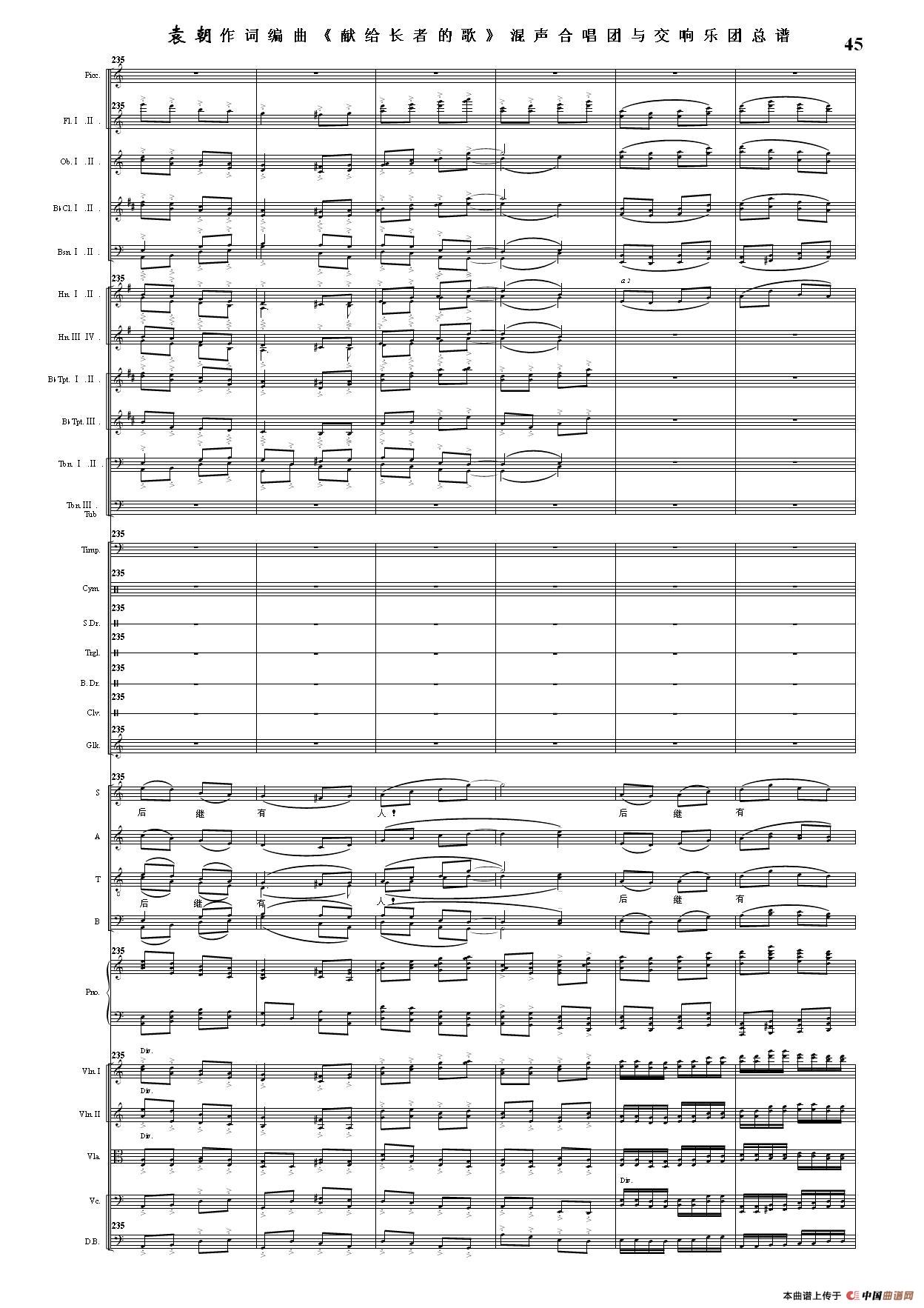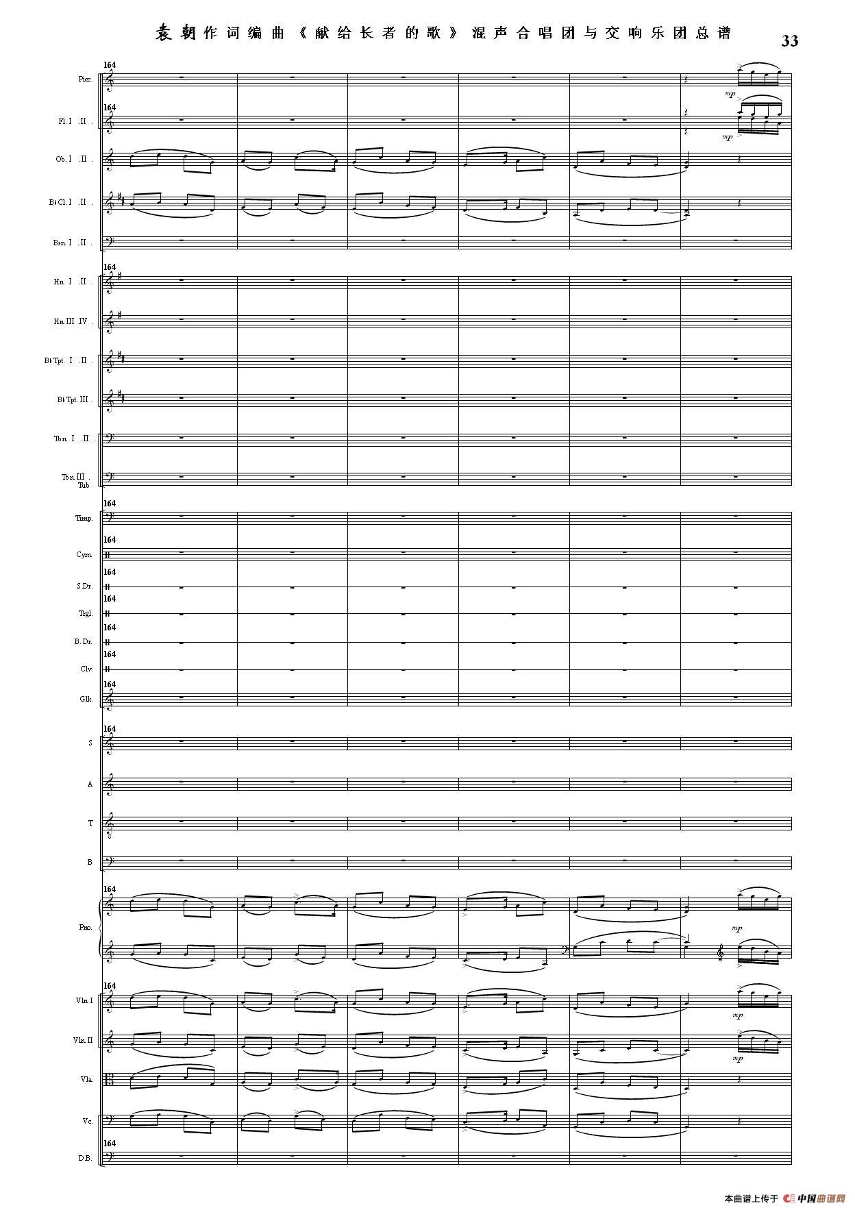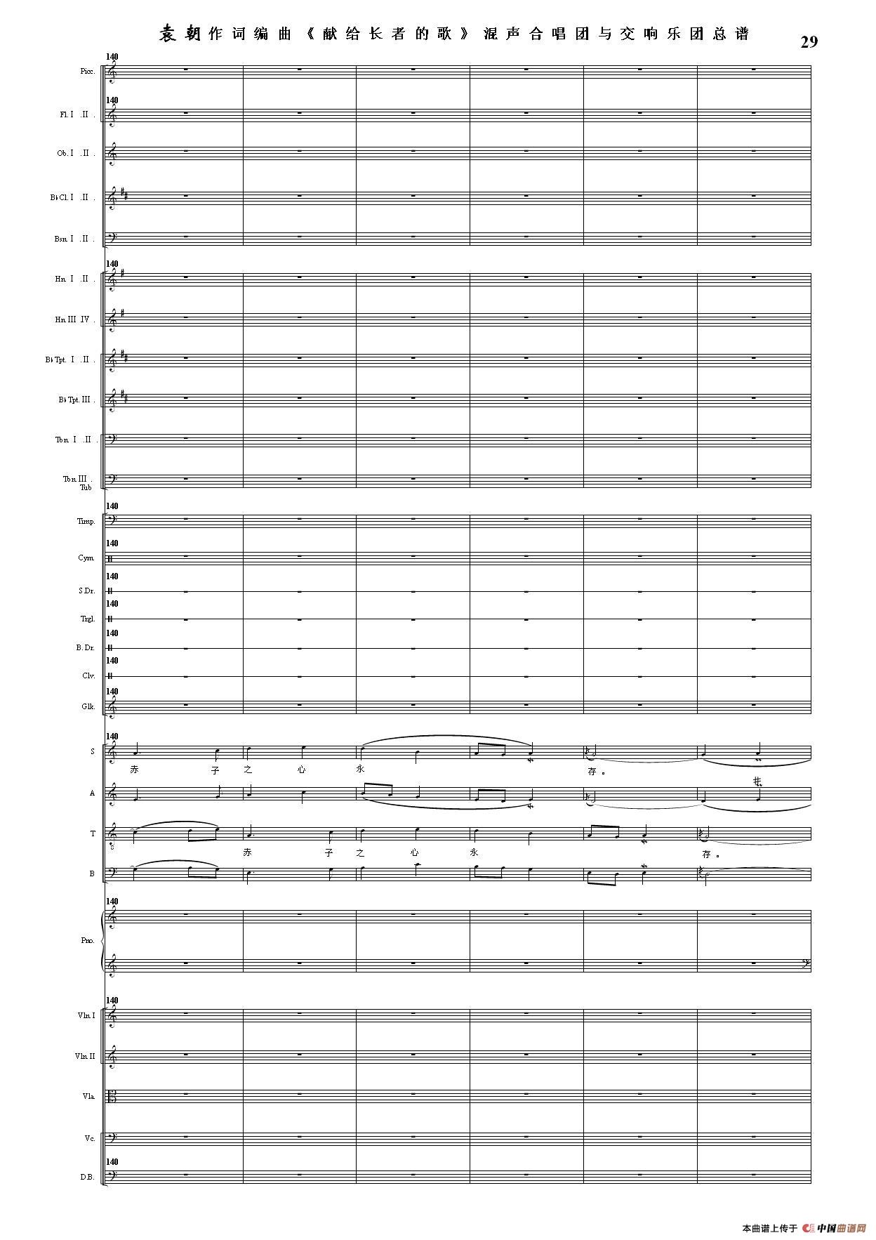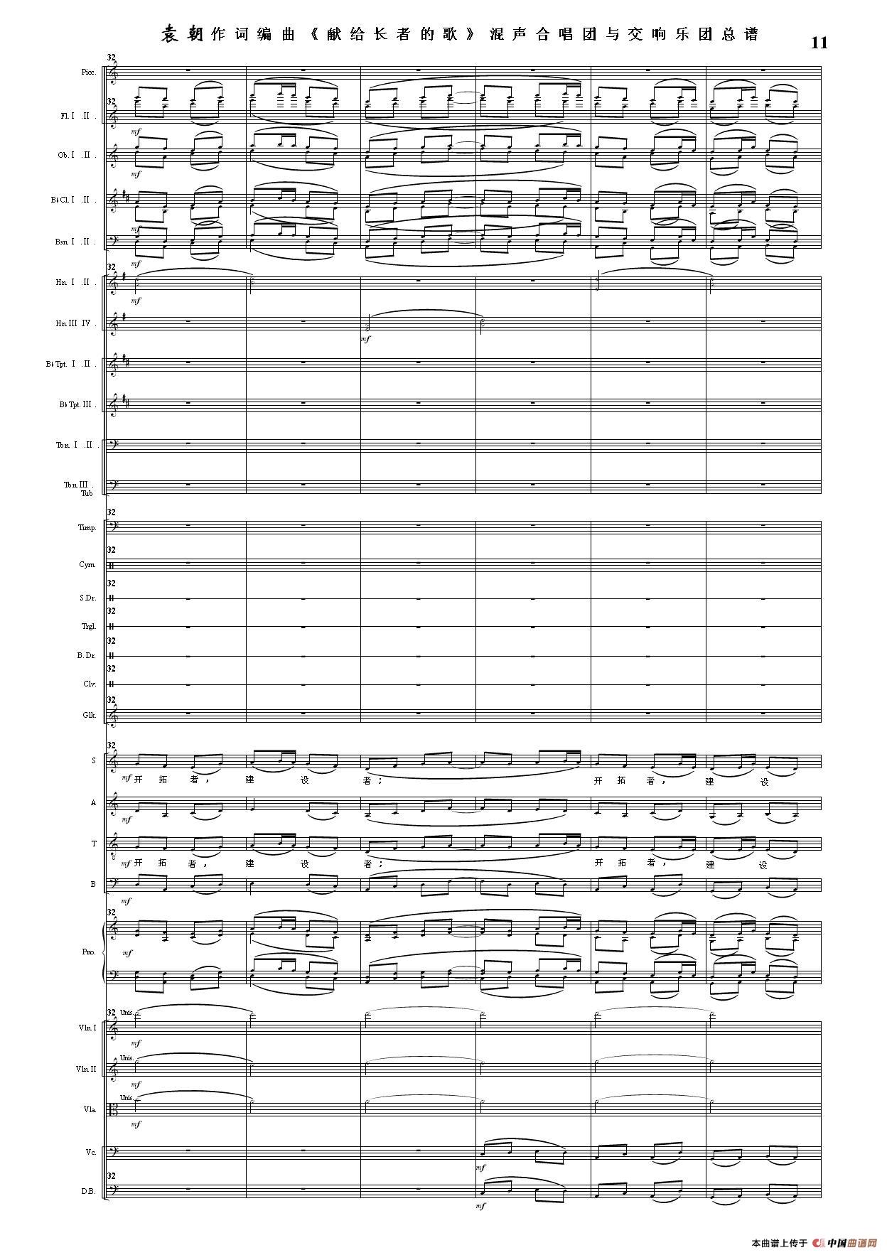 (三)这里发表的是《献歌》的混声合唱与交响乐团总谱,连接的音频也是从制谱软件提取的混声合唱与交响乐团的音频,不是音乐会实况录音。因而只能听合唱音色而不能听见歌词。抱歉!