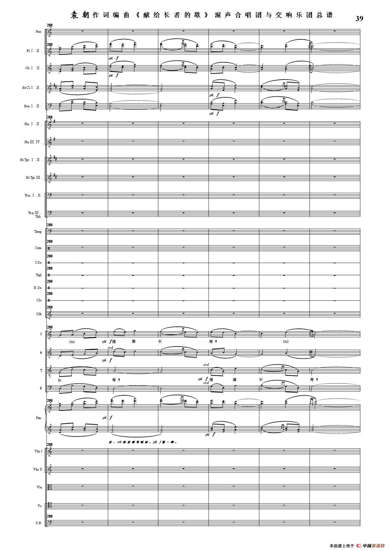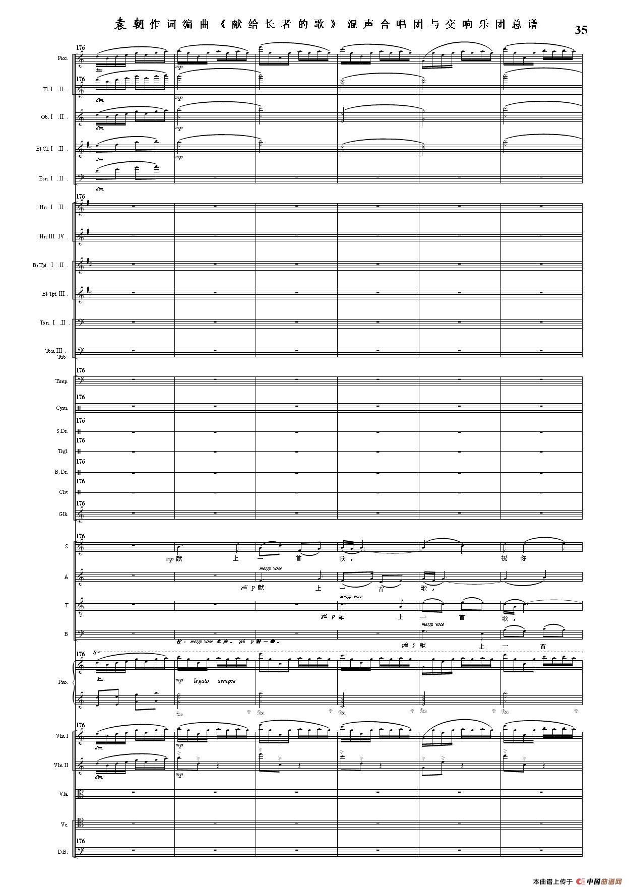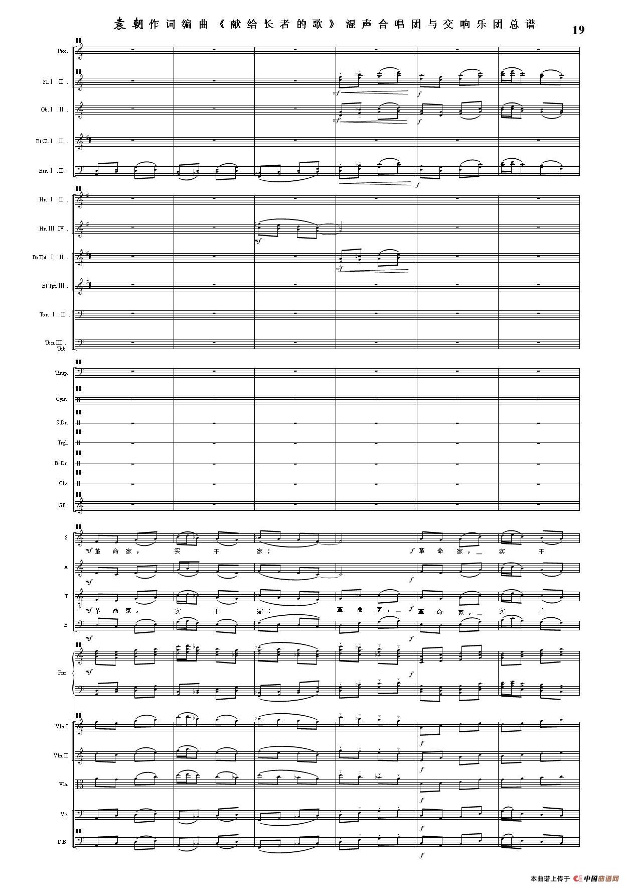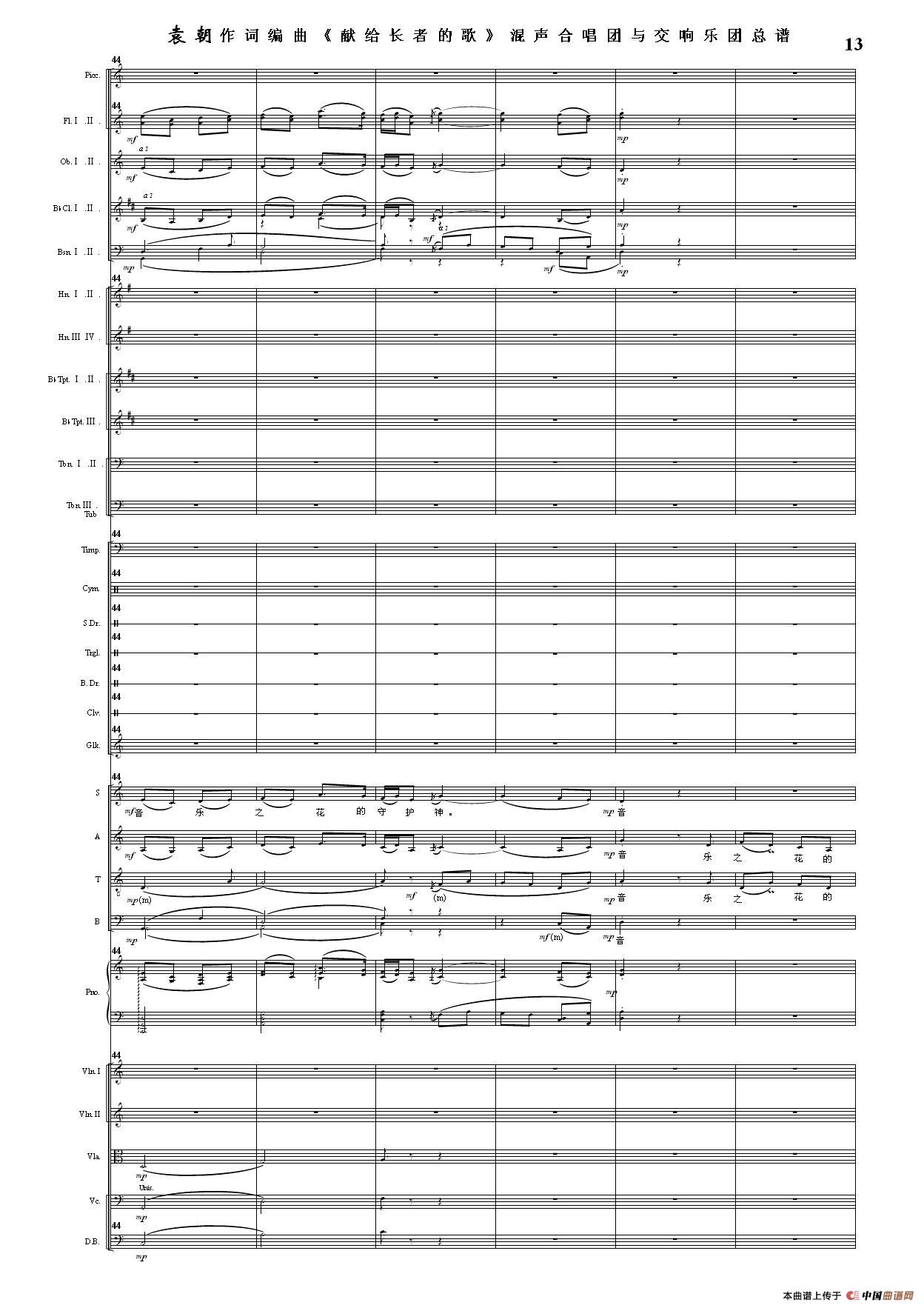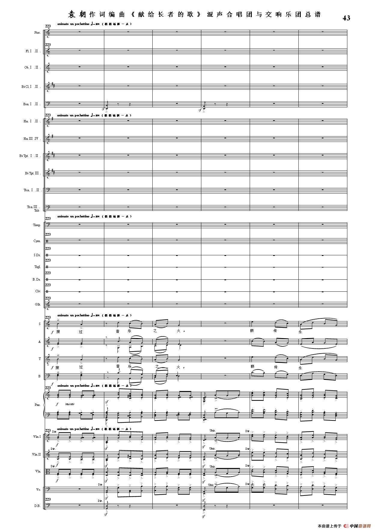 (三)这里发表的是《献歌》的混声合唱与交响乐团总谱,连接的音频也是从制谱软件提取的混声合唱与交响乐团的音频,不是音乐会实况录音。因而只能听合唱音色而不能听见歌词。抱歉!