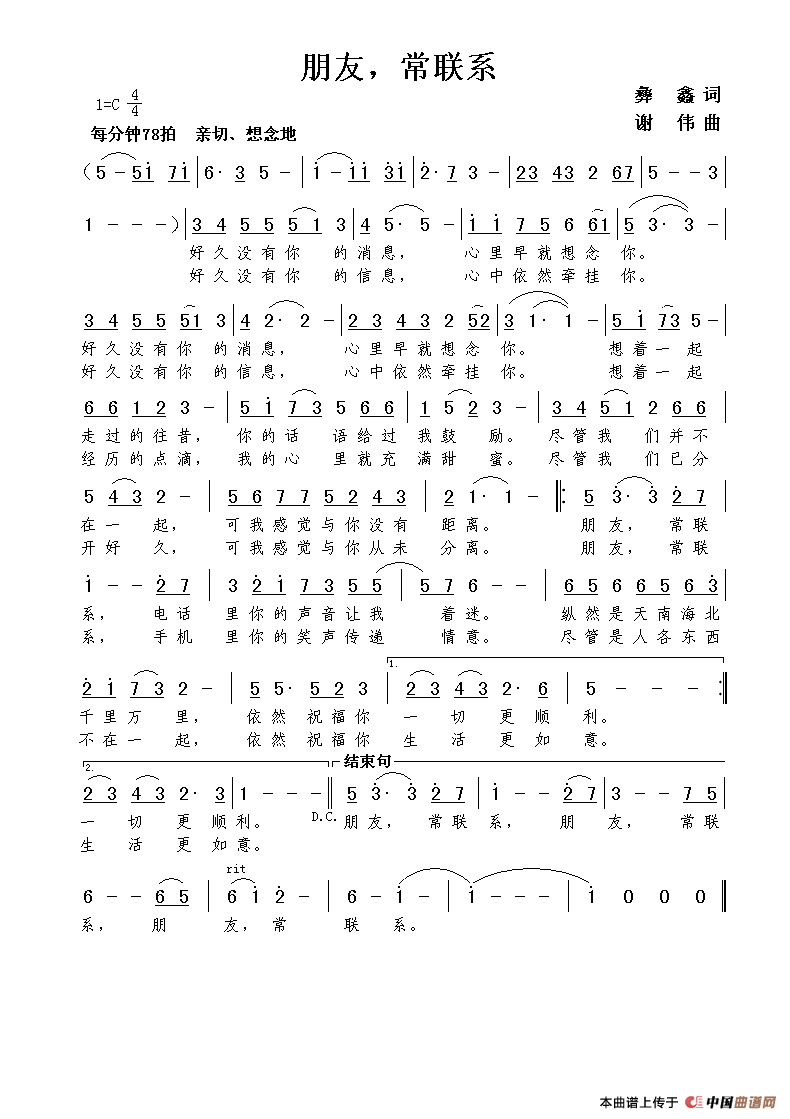 关于《朋友,常联系》曲谱的评论