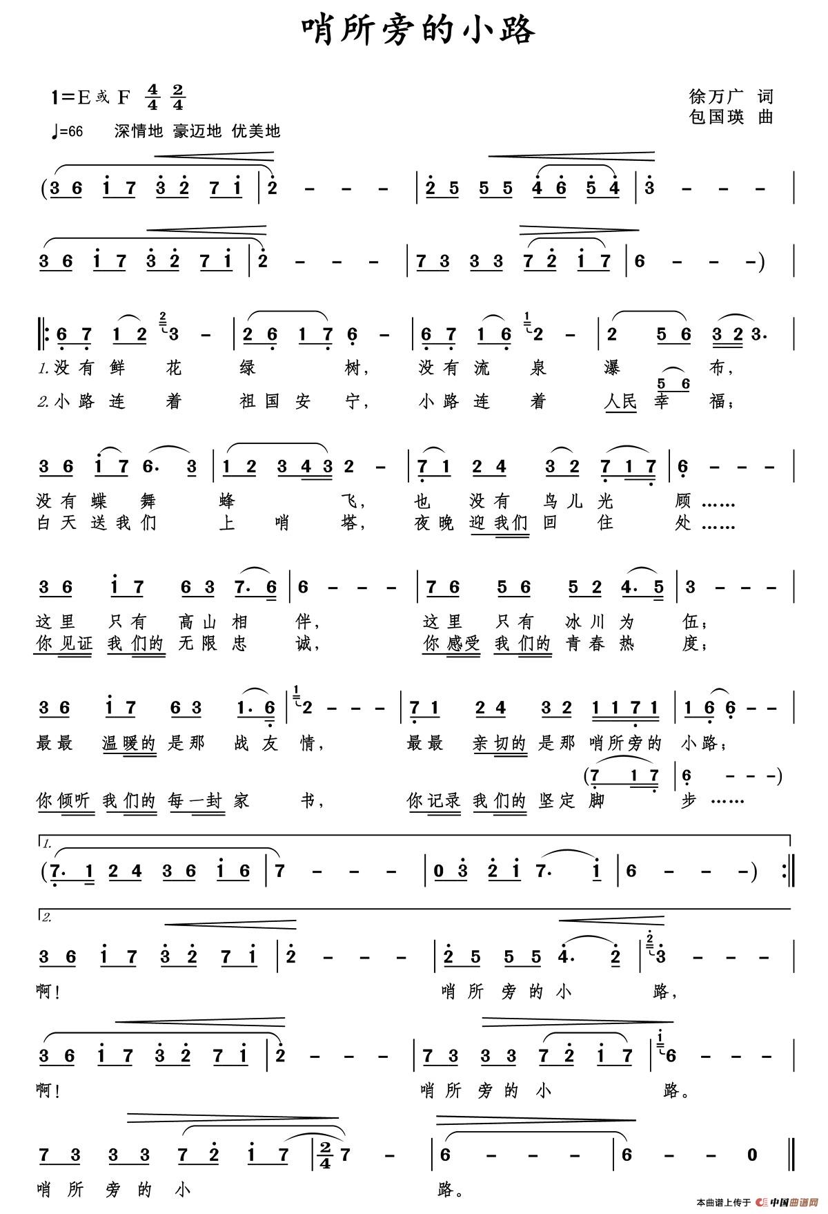 看到徐万广老师创作的歌词(哨所旁的小路)我感慨万千,听到词作者介绍边防哨所的战士生活在生命的禁区可真不容易!连想到前苏联歌曲描绘的奔赴前线的"战火纷飞的(小路),我创作了这首描述"和平年代"的(哨所旁的小路),希望大家记住这些为我们换來和平,安宁生活环境的边防哨所的战士们!