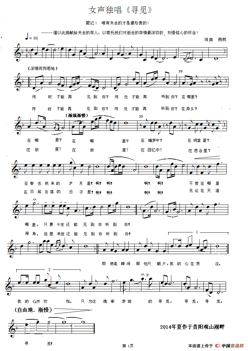 我最近刚谱写的一首以追思、怀念亲人为主题,且比较适合女声独唱(我觉得更加适合美声唱法)的独唱歌曲《寻觅》,并请我的朋友在乌克兰敖德萨国立音乐学院学习声乐的孩子演唱了一个版本,现连同歌谱和演唱版的MP3一起传给大家欣赏!也许,它能够有效地帮助你排解久结于心的思念之苦的情感折磨——非常遗憾的是由于演唱版的MP3文件比系统上传规定的文件大小稍微大了点而不能上传!不过现在我已经将它上传到其它网站,有兴趣的朋友可以到http://www.80xb.com/play/16612.html去欣赏。