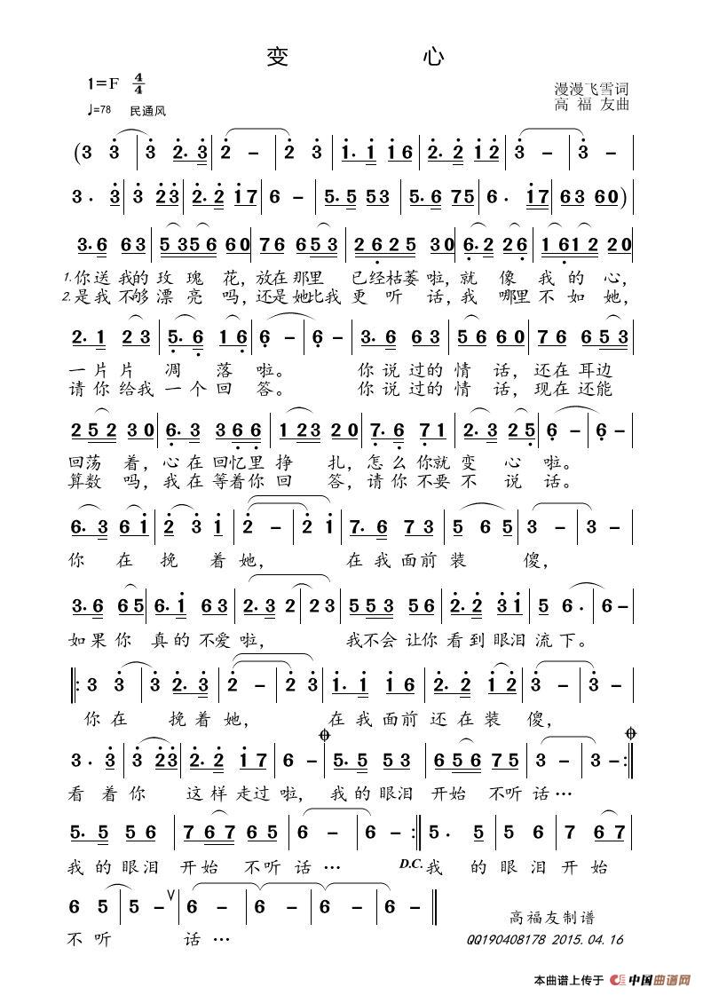 关于《变心》曲谱的评论