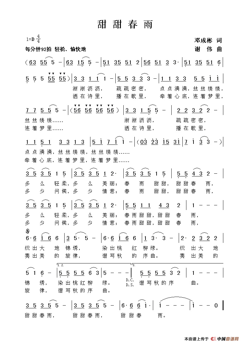 关于《甜甜春雨(邓成彬词 谢伟曲)》曲谱的评论