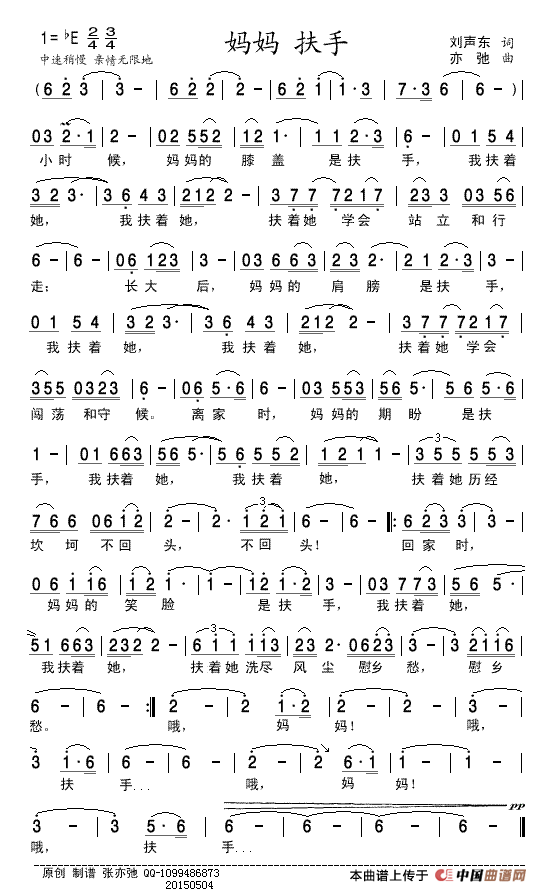 刘声东老师为亡母写的祭文感动了所有读者,也感动了我。天底下最伟大的亲人就是母亲。写妈妈的诗.词.歌太多太多,当下,刘老师的这篇《妈妈》写出了许许多多做儿女的感受,也包括我。按捺不住内心的感动,我选了其中一段谱了曲,歌名《妈妈 扶手》。在此要非常慎重地说明的是,我是无法直接去请教,打扰到老师的。为了歌曲的需要,我擅自将老师的文字作了一点点微小的改动,如果老师有知,还望海涵。如诺不允或有侵权,学生即刻还原或者撤下。学生不敬,恭请谅解!