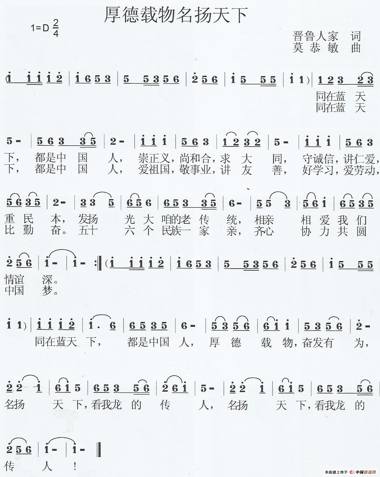 歌词《厚德载物 名扬天下》道出了“道德高尚者能承当重大任务”,因而提倡“万事德为先”的精神。曲作者对原词做了稍许修改。