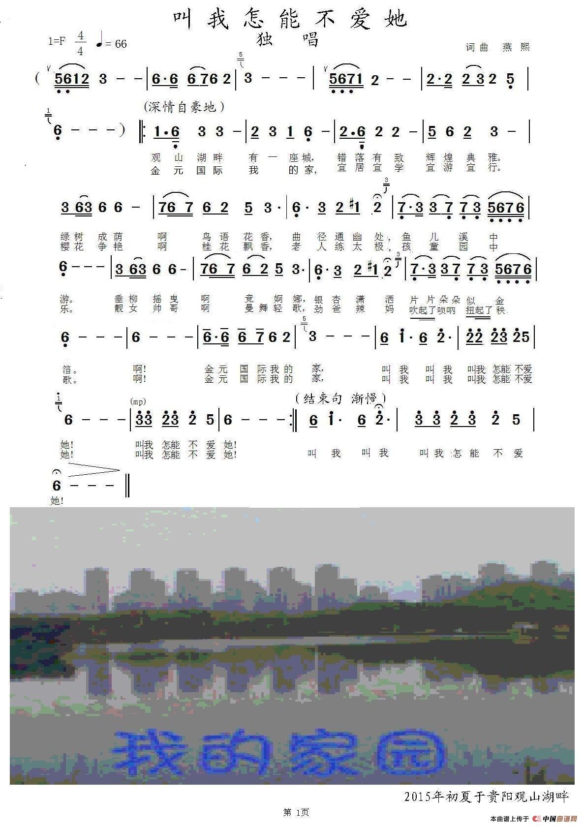 如果你有机会来到贵阳,无论你有多忙,可千万不要错过到观山湖公园游览的机会!当然,只要你到了观山湖公园,自然会有机会一睹我的家园《金元国际新城》的风采——那你一定会感到这首小曲对《金元国际新城》的赞美之词,说它轻描淡写、挂一漏万实在是最恰当不过了——真如看见这首曲谱的朋友所指出的那样:《金元国际新城》还有许多值得大书特书的亮点——奇花(腊梅、红梅、杜鹃、蔷薇、睡莲......)异果(红叶李、杨梅、蟠桃......);珍稀名木(香樟、水衫、红豆衫......)异兽(白鹭、松鼠、喜鹊.....);更有那闻名遐迩、风情万种的风情一条街等,恕我无能,均未能在这首小曲中有所提及,有所表现